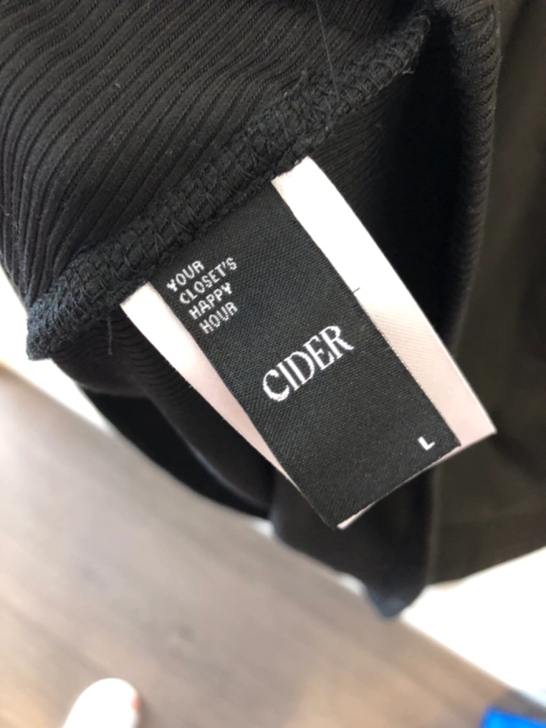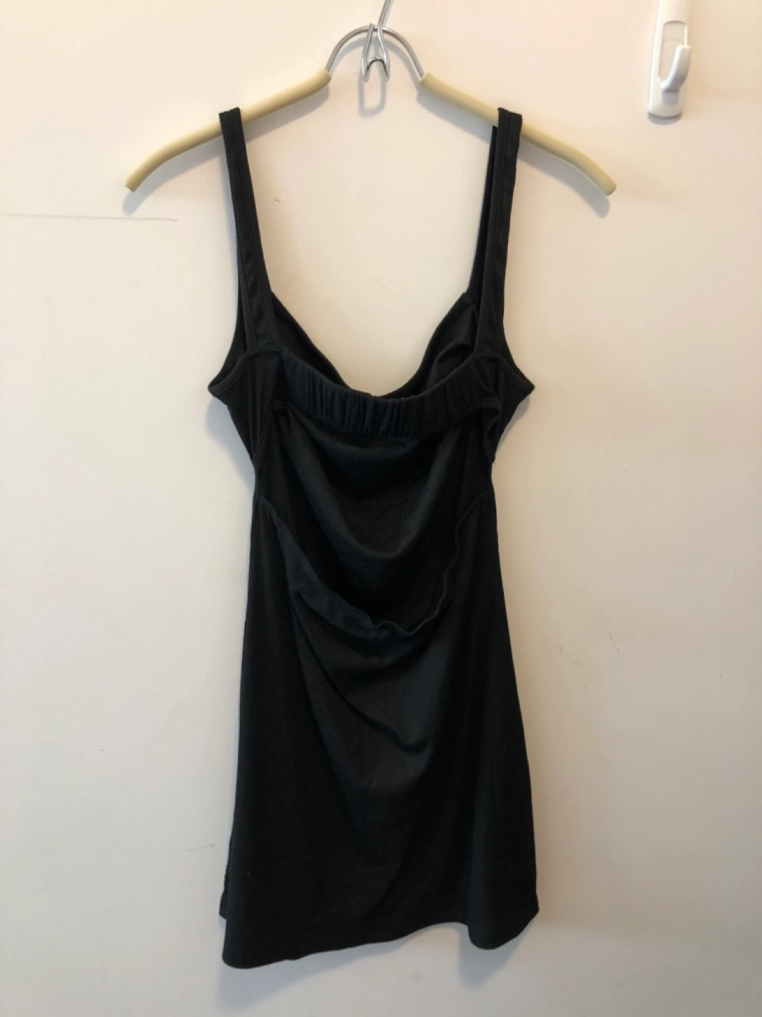 Black mini dress. Spaghetti straps. Scooped neckline. Fitted silhouette. Size Large.