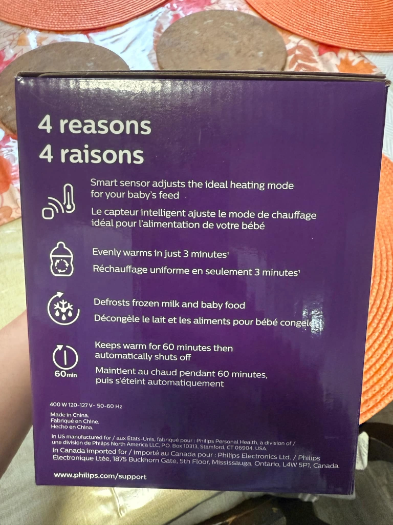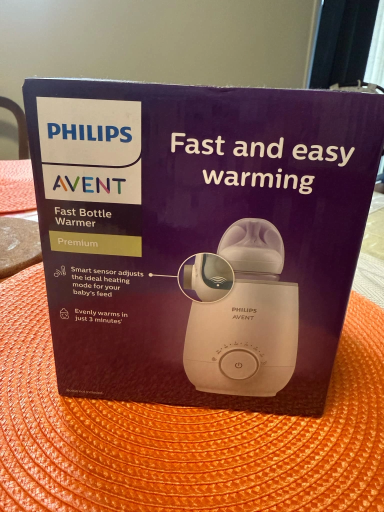 Brand new in box. Fast and easy warming. Smart sensor adjusts the ideal heating mode. Evenly warms in just 3 minutes. Defrosts frozen milk and baby food. Keeps warm for 60 minutes then automatically shuts off.