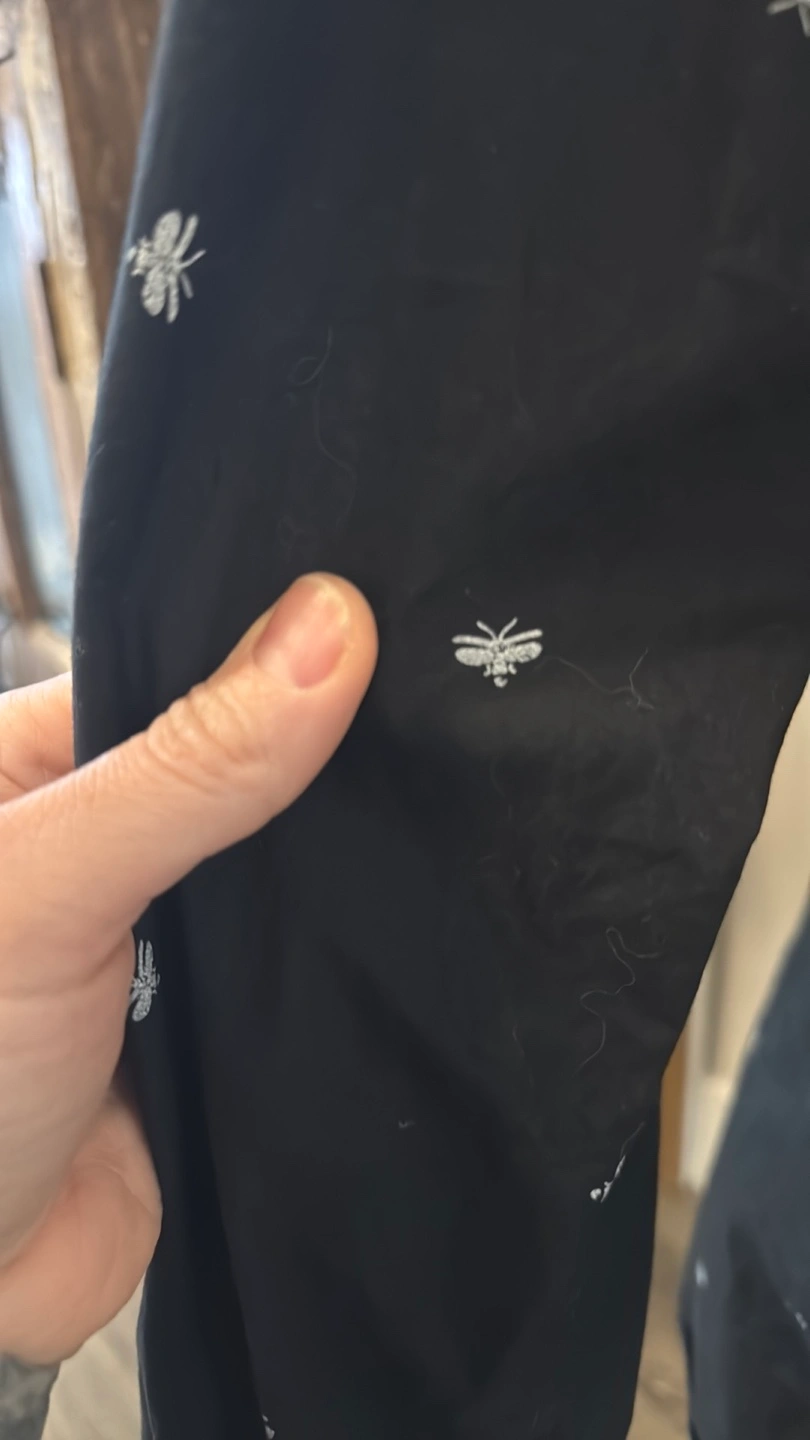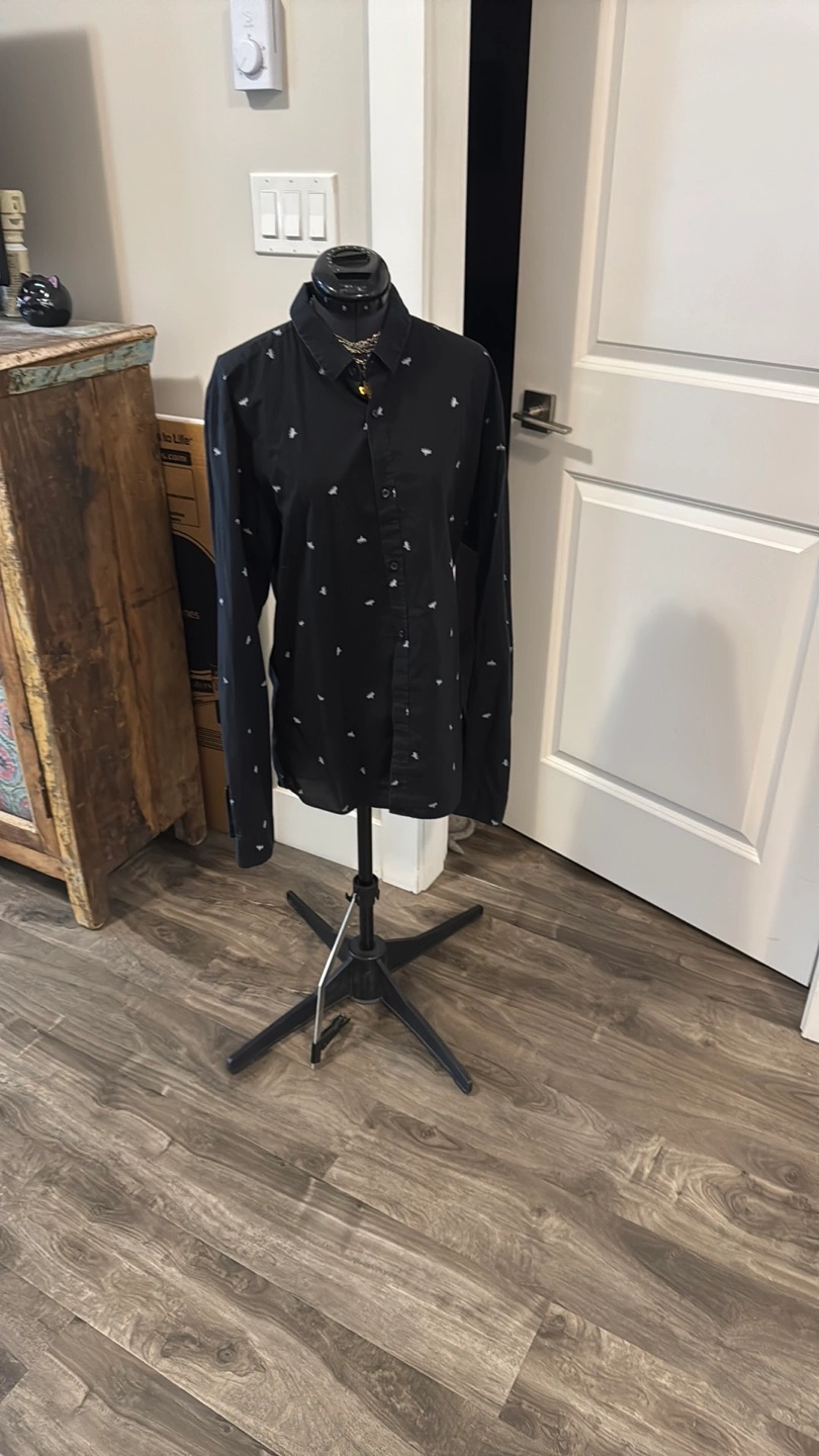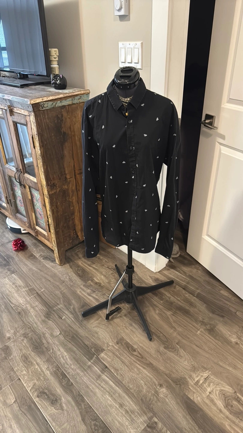 Stylish black button-up shirt featuring a subtle grey pattern. Perfect for casual or formal occasions. Light fading from wear. All over embroidered grey bees. Machine wash. Some stretch. I wear as med female