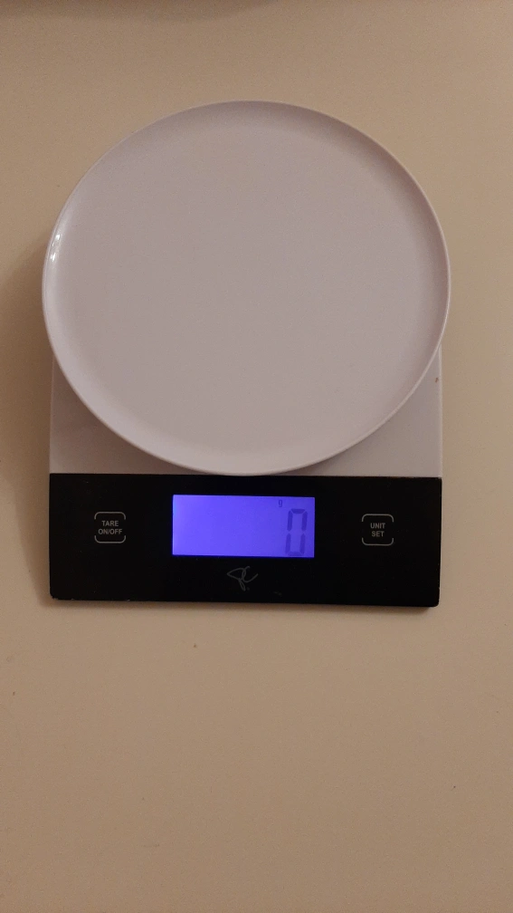552Portable digital kitchen scale. White platform, black base. Tare and unit functions. Measures in grams. Batteries included π