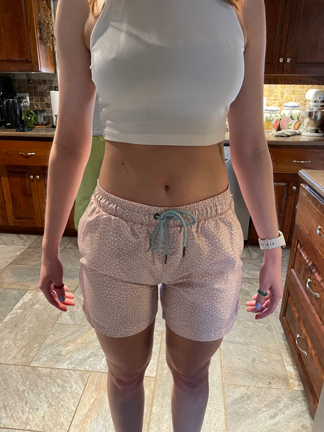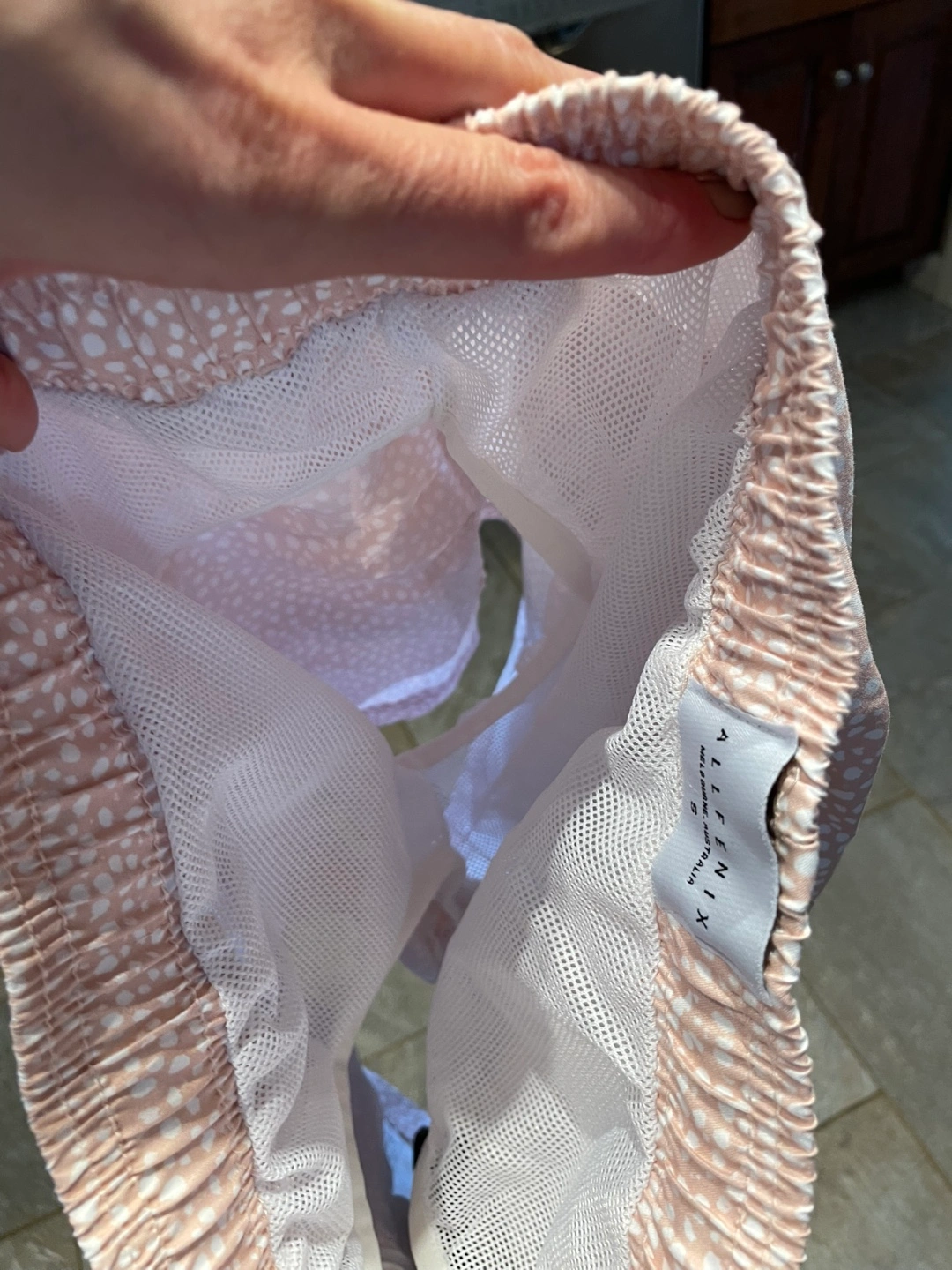 Alfenix swim trunks, size small. Pink with a white dalmatian print. Drawstring waist. Mesh liner. Excellent condition.