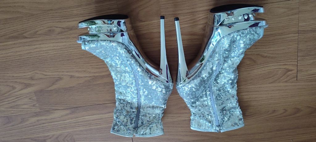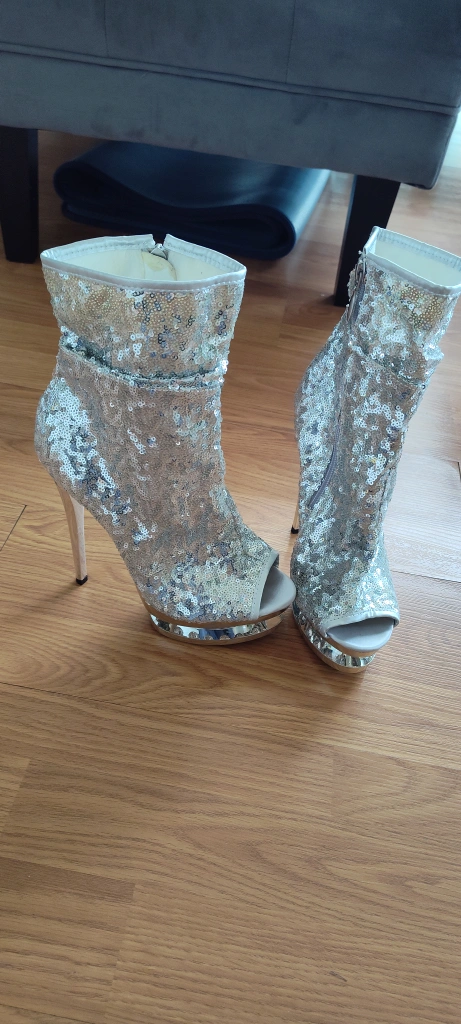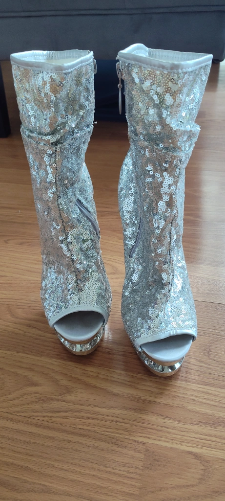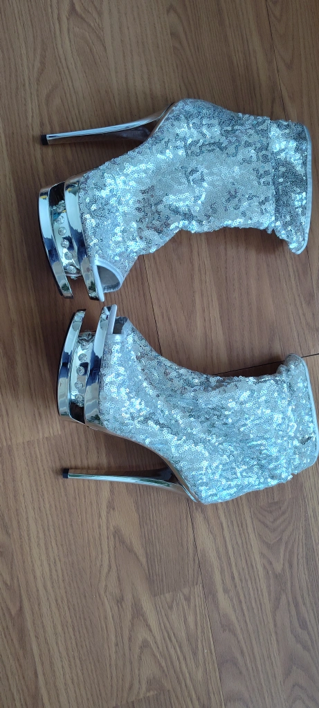 1000+Stunning silver sequin platform boots. Open toe, high heel, side zipper. Elegant and eye-catching. Check out my other listing. There may be something else you're also interested.