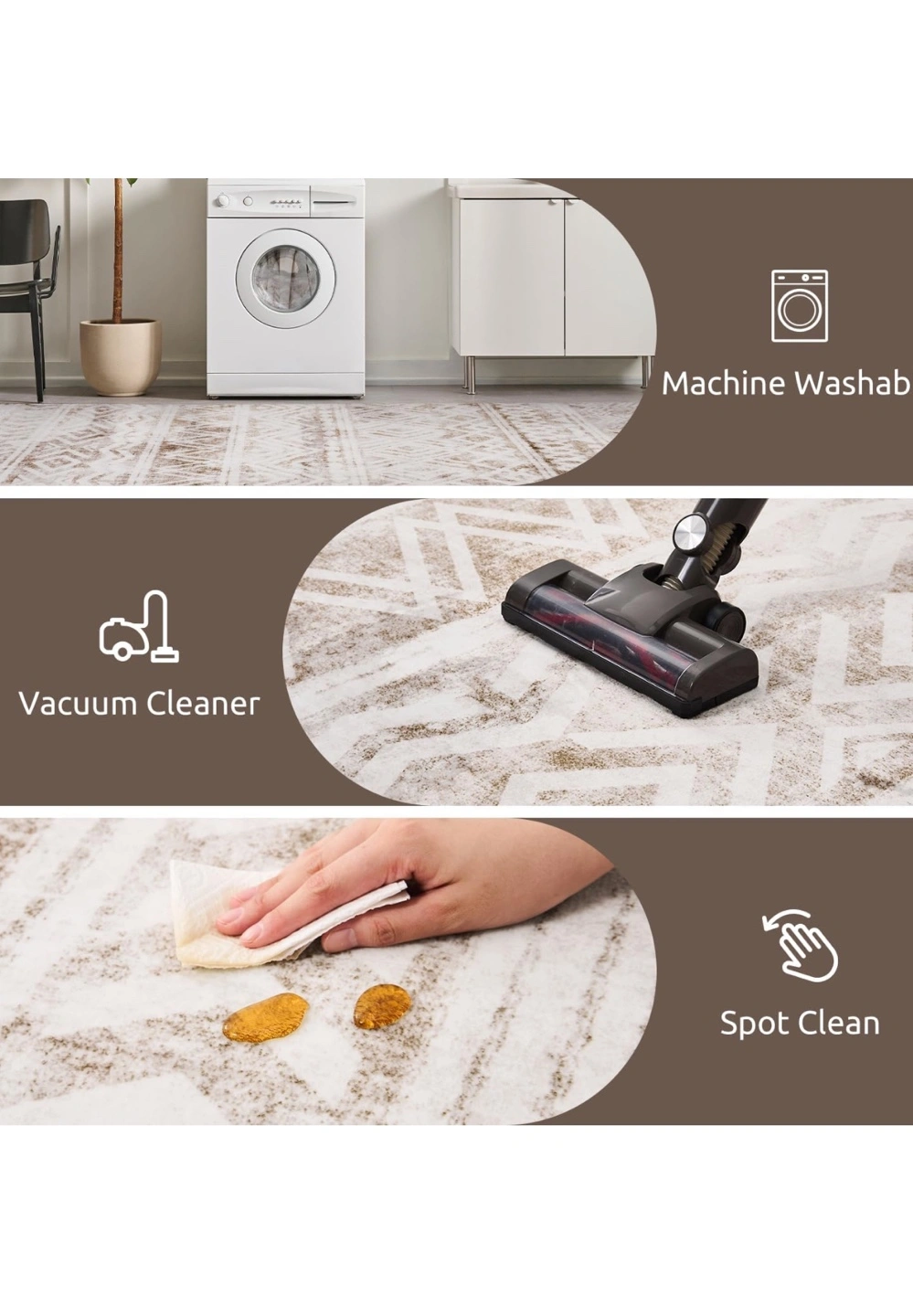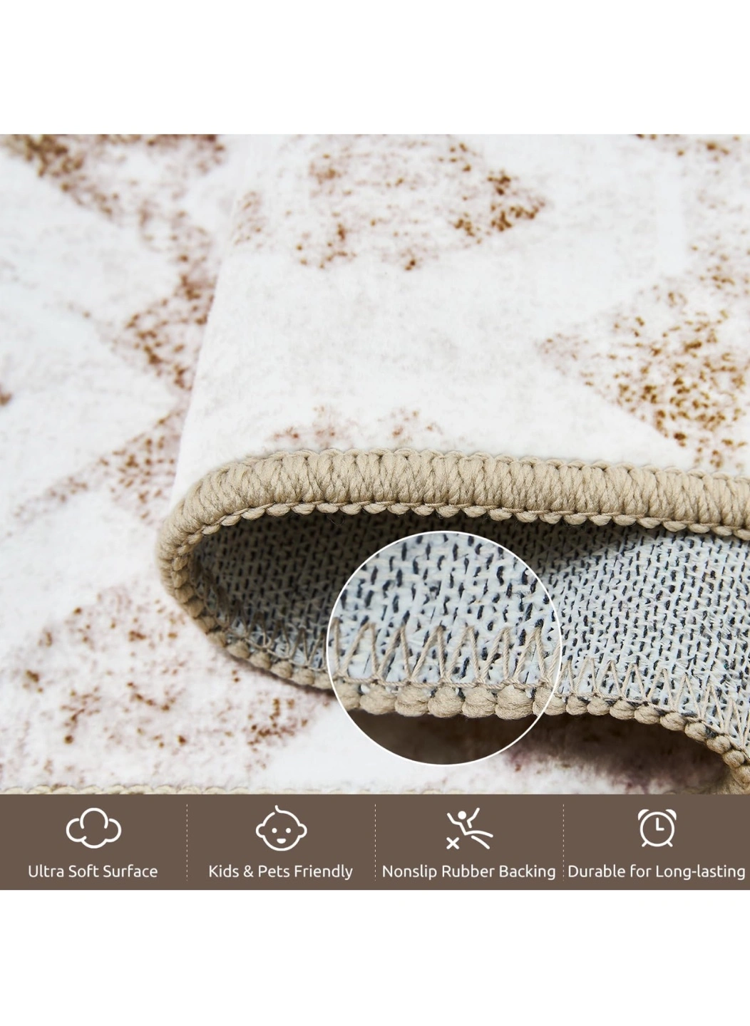 Beautiful large area rug. Measures 8ft x 10ft. Features a beige and white geometric pattern. Machine washable, vacuum cleaner friendly, and spot cleanable. Ultra soft surface, kids and pets friendly, non-slip rubber backing. Durable and long-lasting.