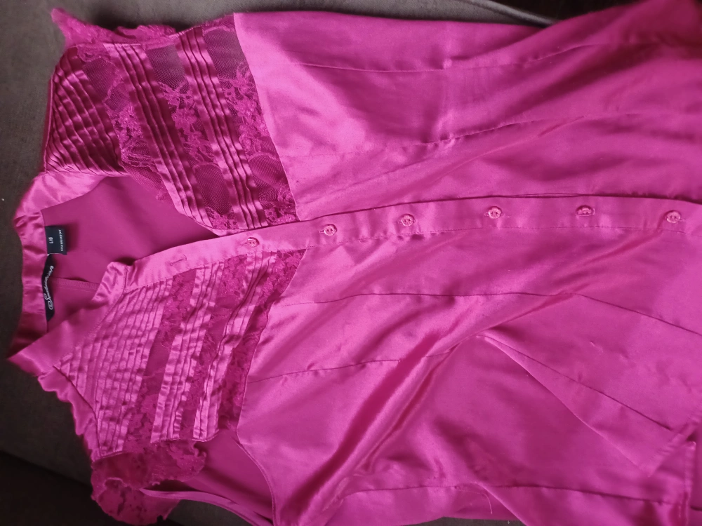 1000+Women's size L pink satin blouse. Features a button-front closure and lace detailing at the shoulders and collar. Sleeveless. yonge n sheppard