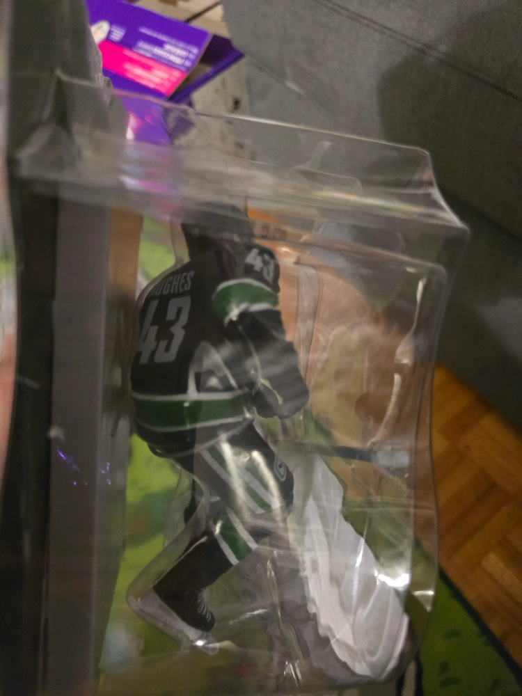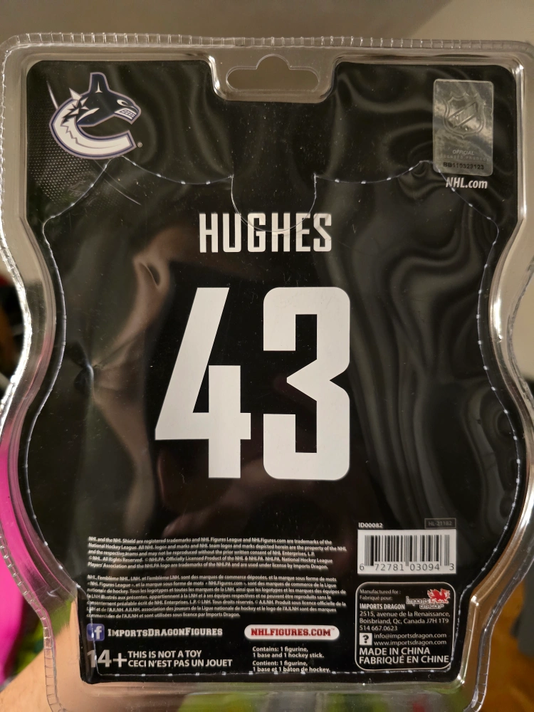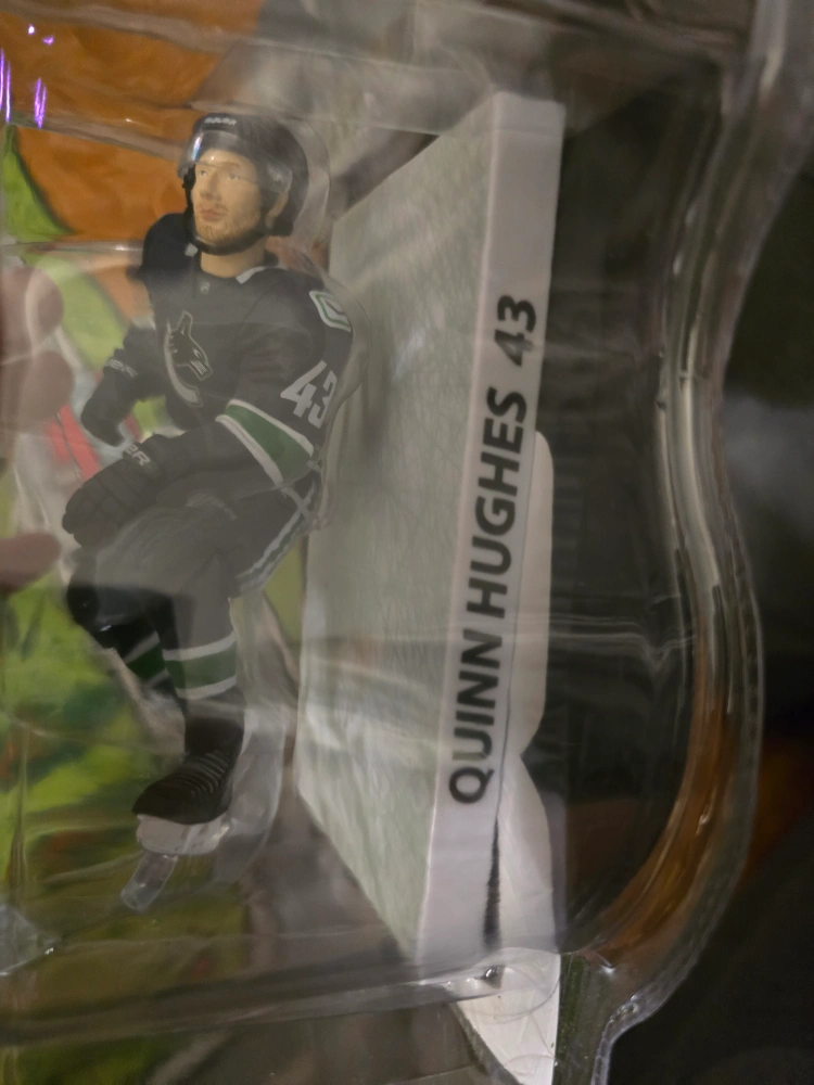 New in box. Quinn Hughes Vancouver Canucks NHLPA figure. Number 43. Collectible figure with hockey stick. Great for fans!