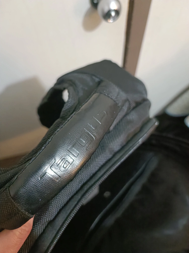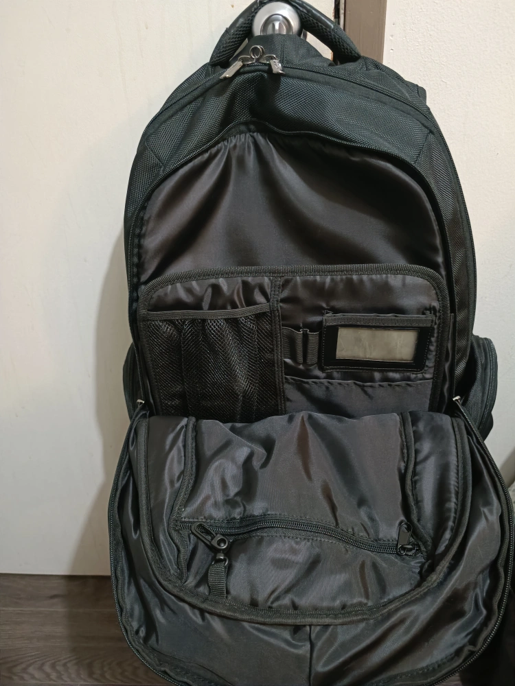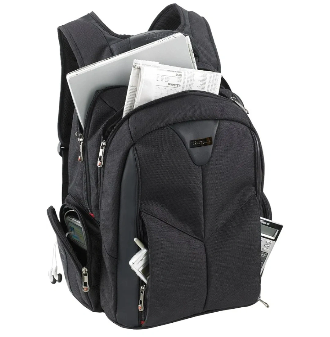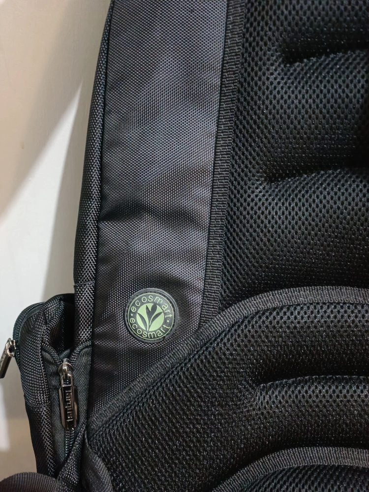 Black laptop backpack. Multiple compartments. EcoSmart branding. Suitable for carrying a laptop and other items. Durable and functional design.