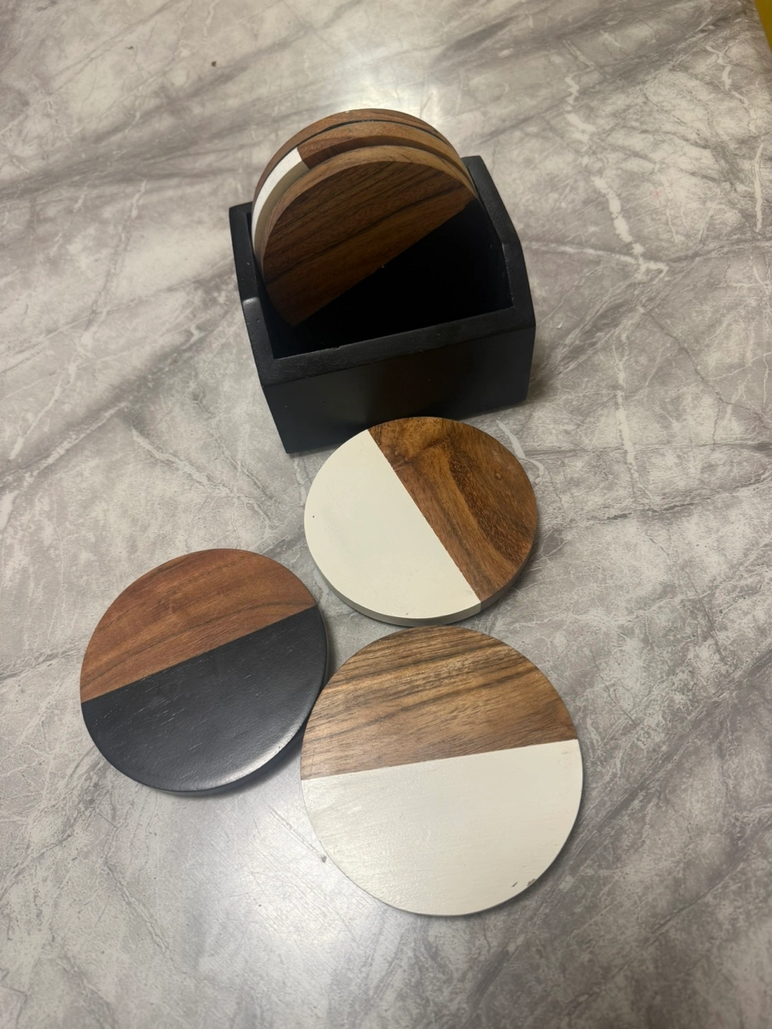Set of six round coasters. Two-toned design. Black and white with wood grain. Includes a black wooden holder.