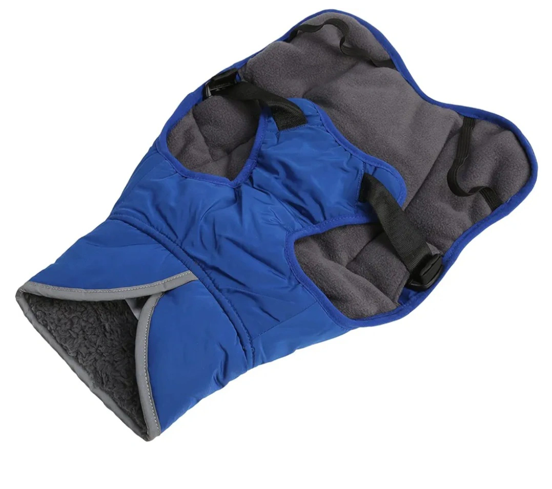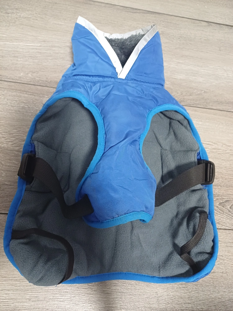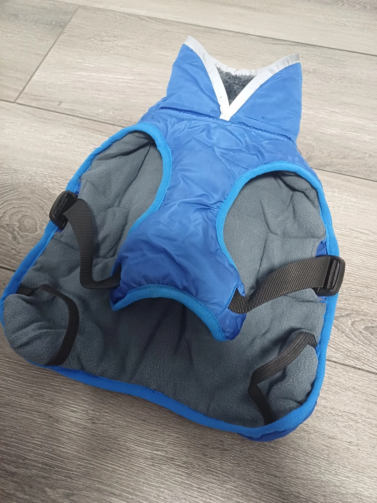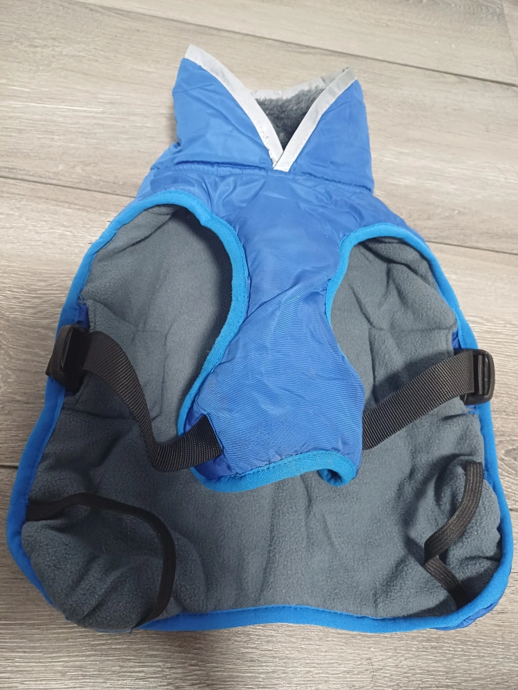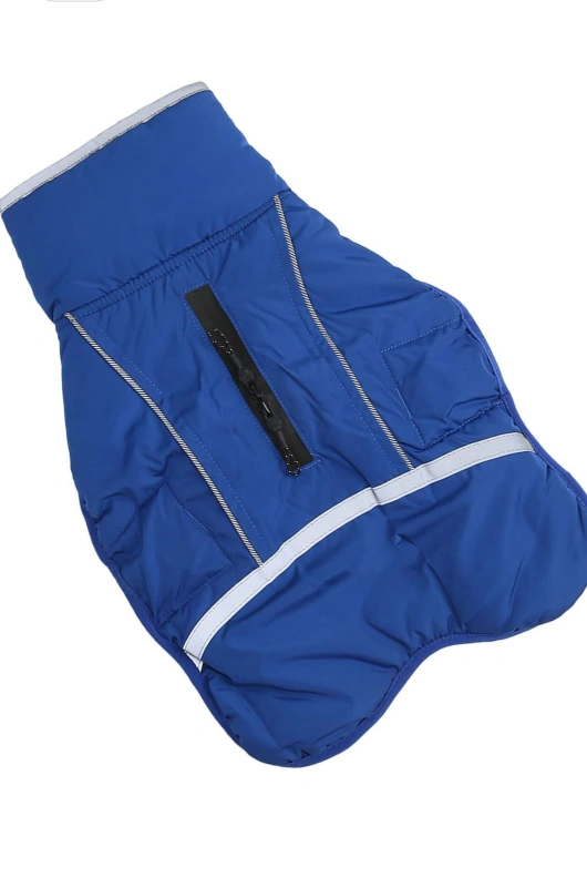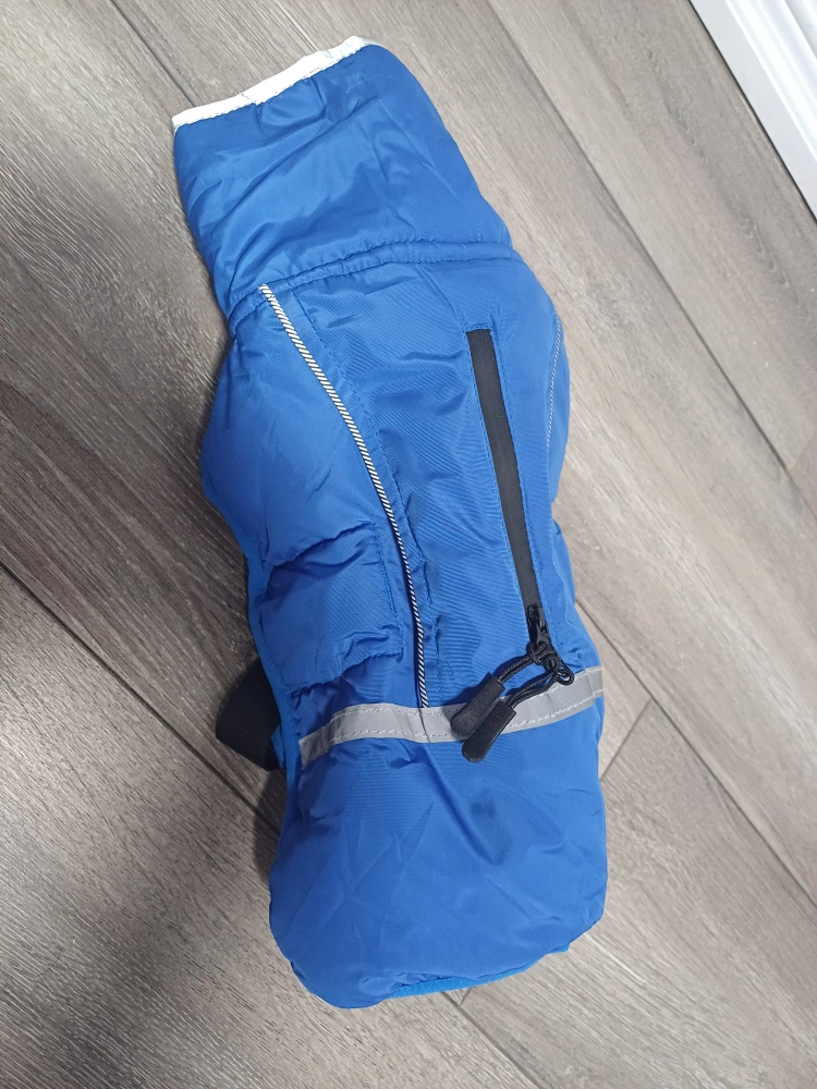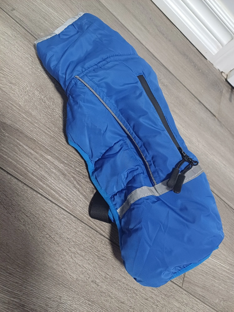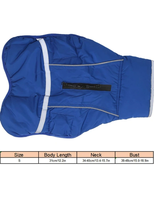 107Brand new.... Blue...Warm, quilted, reflective, dog coat. Size small. Features a zipper closure and reflective strips. Fleece lining. Adjustable straps. 100% Polyester fabric.