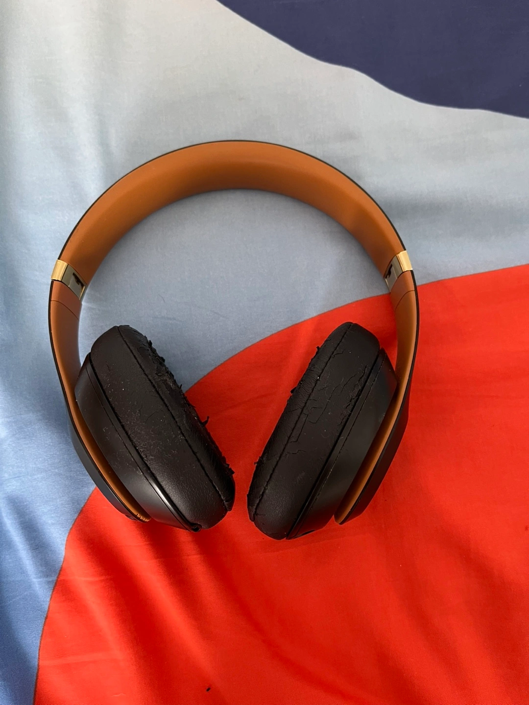 Wireless over-ear headphones. Black with tan headband. Earcup cushions are worn out. The whole band has been replaced and is new. Includes cable.