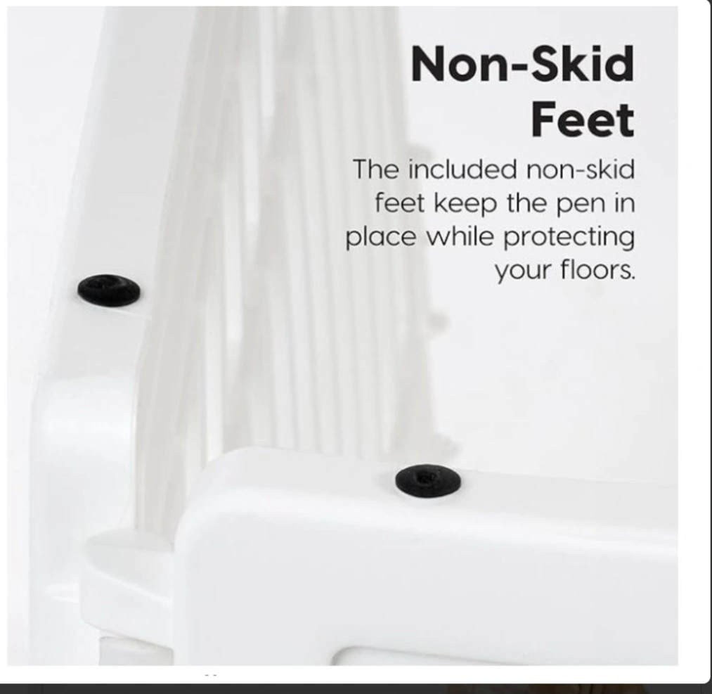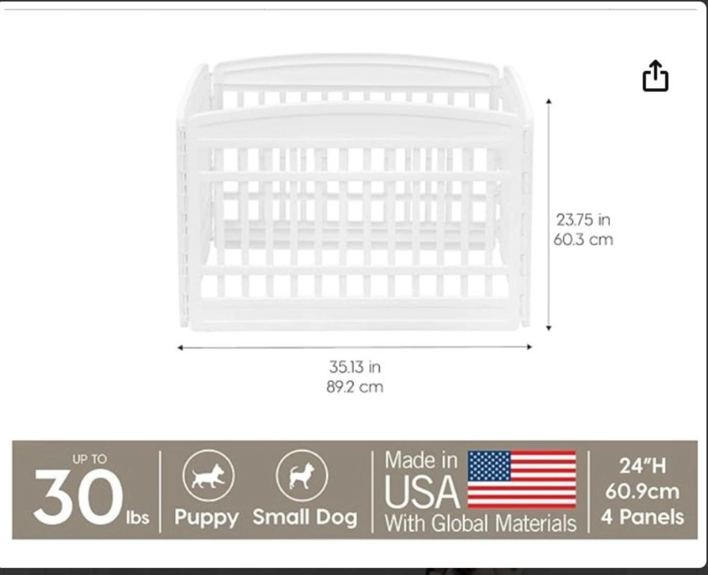 Foldable pet pen. Four panels. White plastic construction. Non-skid feet. Suitable for small dogs or puppies up to 30 lbs. Made in the USA with global materials.