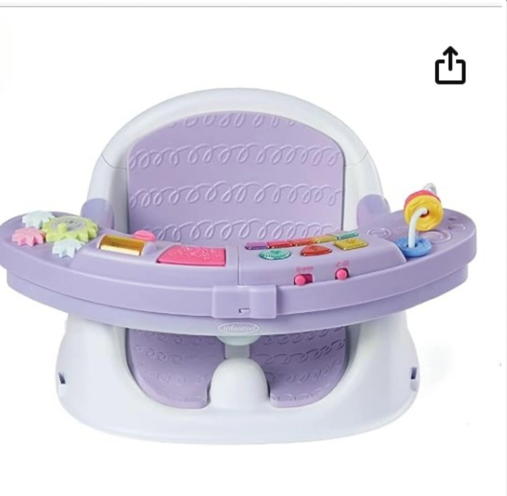 Versatile baby seat. Three functions: seated positioner, snack time booster, table booster seat. Features light-up piano. Purple and white.