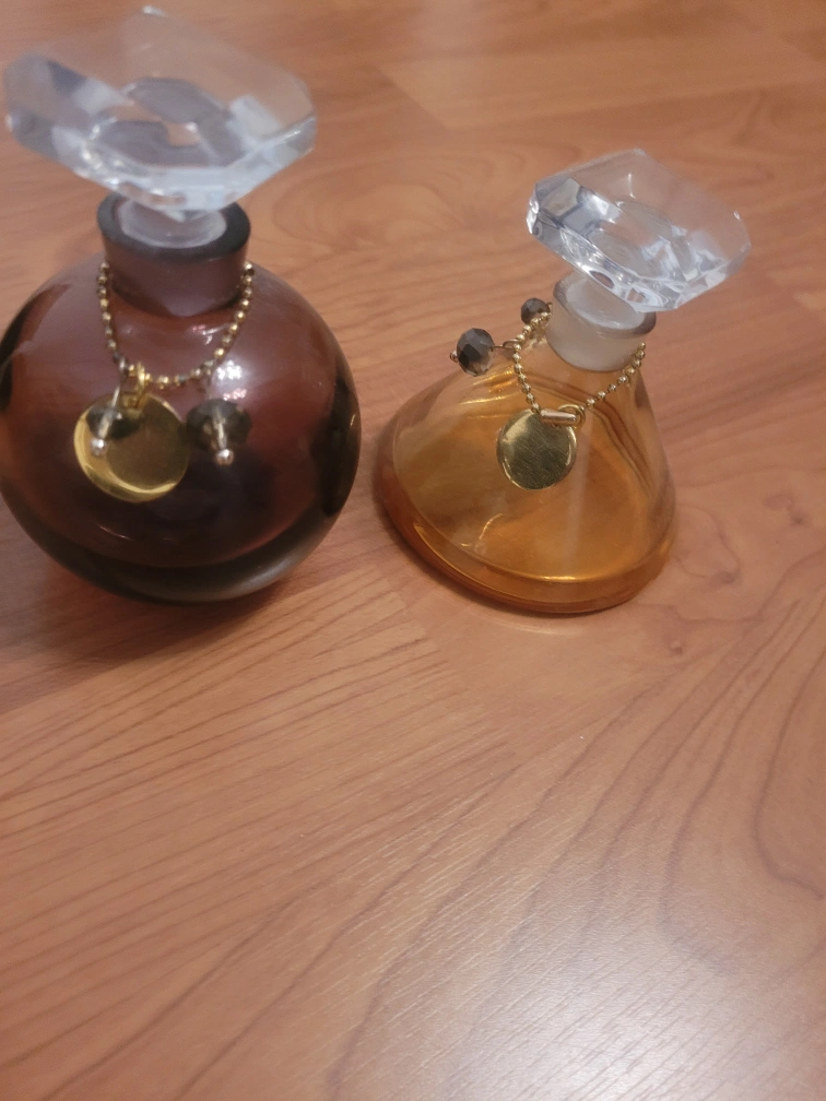 31Pair of vintage-style perfume bottles. Glass bottles with ornate stoppers and decorative chains. One bottle is dark brown, the other amber. Great for display or use as unique home decor.