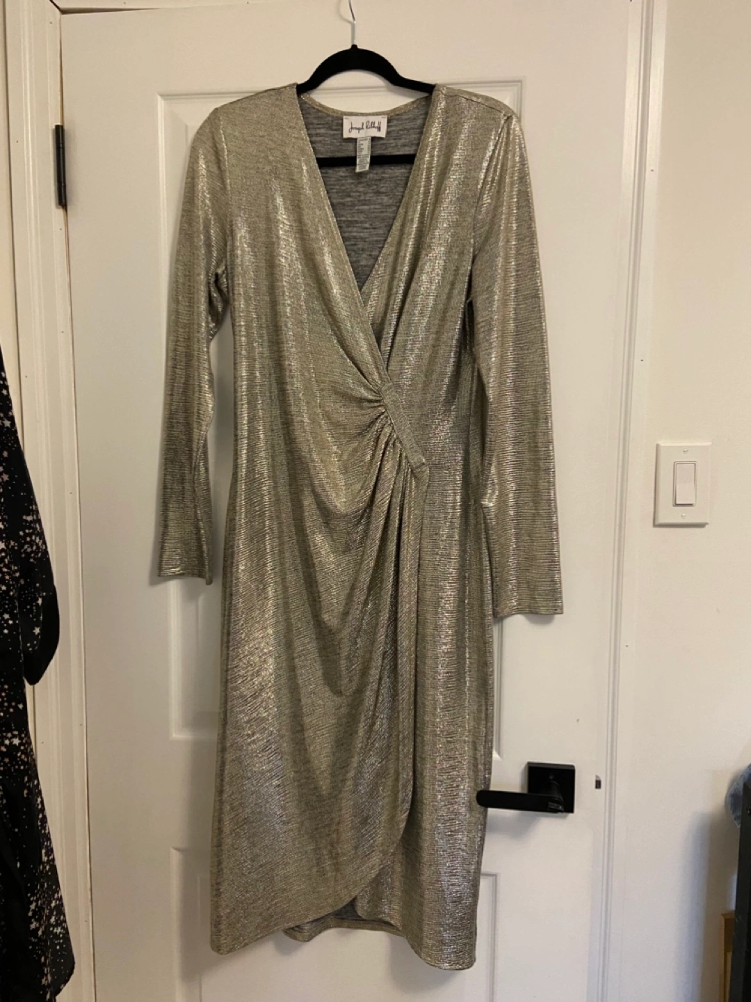 Stunning metallic gold wrap dress. Long sleeves, V-neck. Made in Canada with imported materials. Size 10.