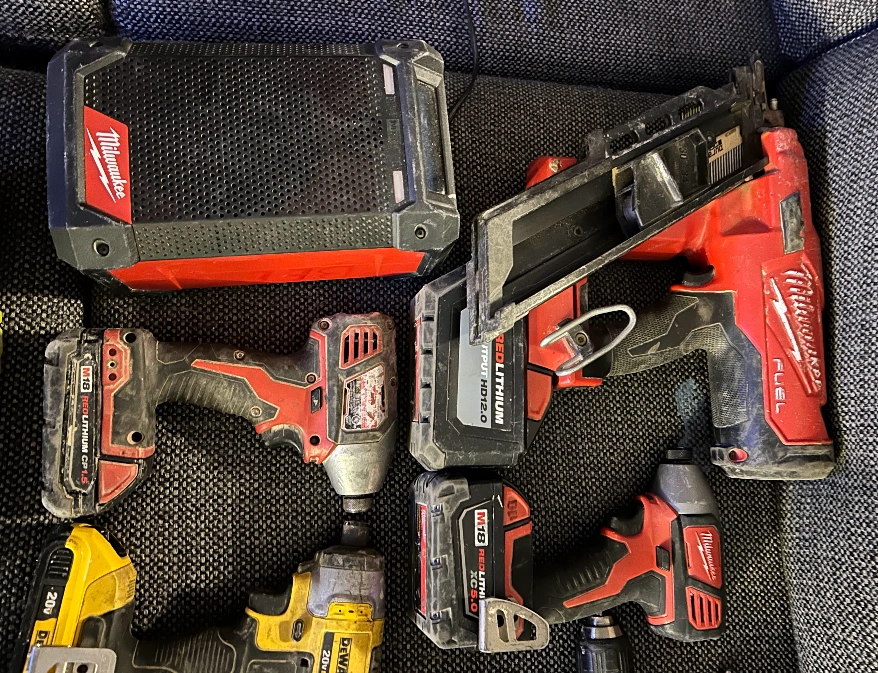 Several Milwaukee power tools. Includes impact drivers, a framing nailer, and a battery pack. All tools appear well-used but functional. Sold as a lot.send me a fair price :)