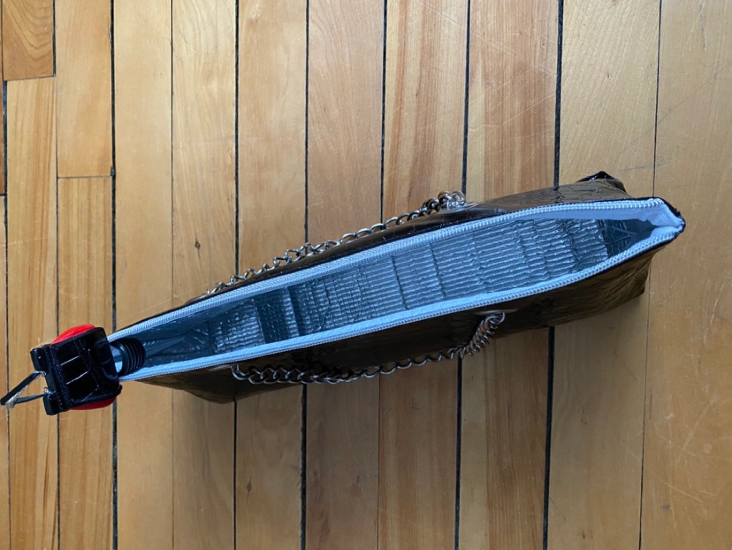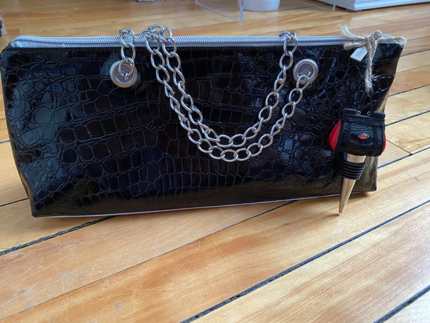 Features a crocodile-print design, silver chain straps, and a zipper closure.