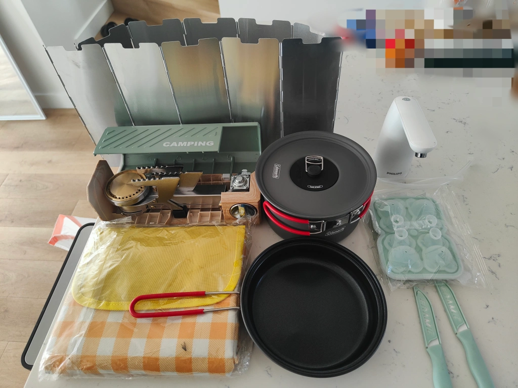 Complete camping cookware set. Includes gas portable stove, windscreen, pots, pan, ice cube tray, 2 knife and picnic mat. Philips water dispenser also included. All brand new