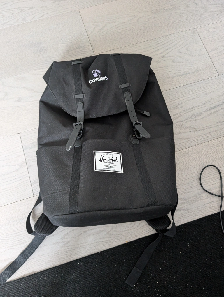 Black backpack. Features adjustable straps and magnetic closure. great size for large items and to use as an overnight bag.