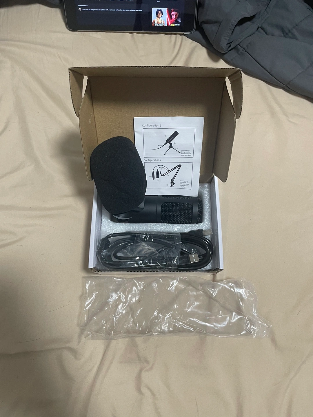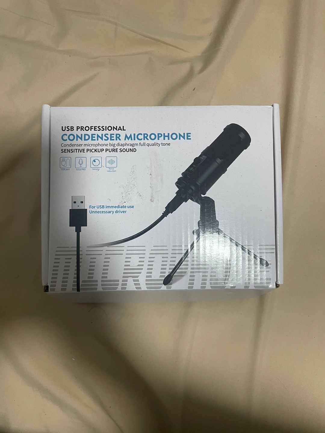 New USB microphone. Includes pop filter, tripod stand, and USB cable. Plug and play. Great for streaming or recording. Has adjustable sound dial and can mute.
