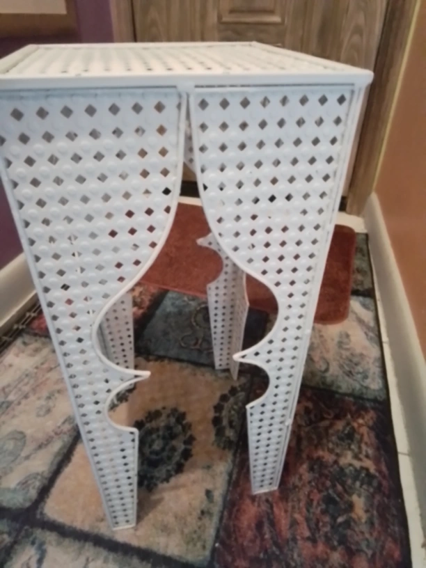 114Moroccan Style Metal Stand Unique White Metal Plant Stand Moroccan style metal stand, sturdy, ivory color. Can be spray painted to match your decor. Sold as is. Condition: good Measurements: H25.5"xW11.75" Small square plant stand. White metal with cut-out design. Openwork design. Ideal for small plants or decorative items. Pickup at Young Street and Steels Ave