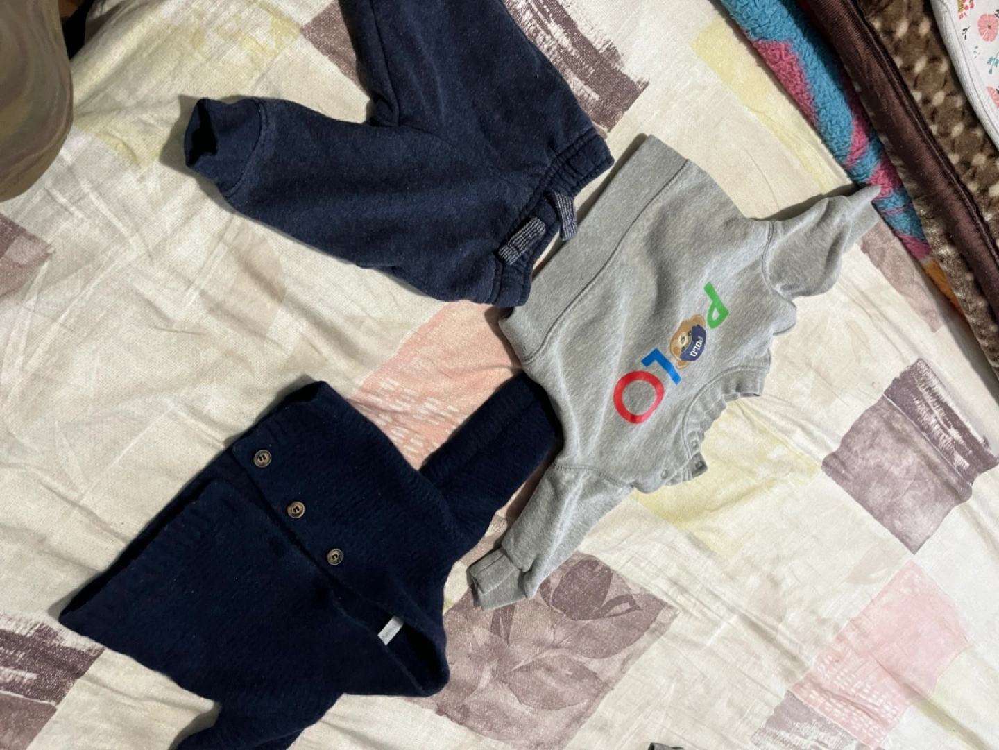 Large bundle of baby boy clothes. Includes sleepers, tops, pants, and a hoodie. Various colours and patterns. Great for everyday wear. Sizes range from 0-6 months. Please check my other listing to for more items.