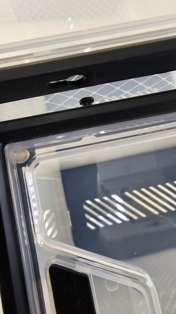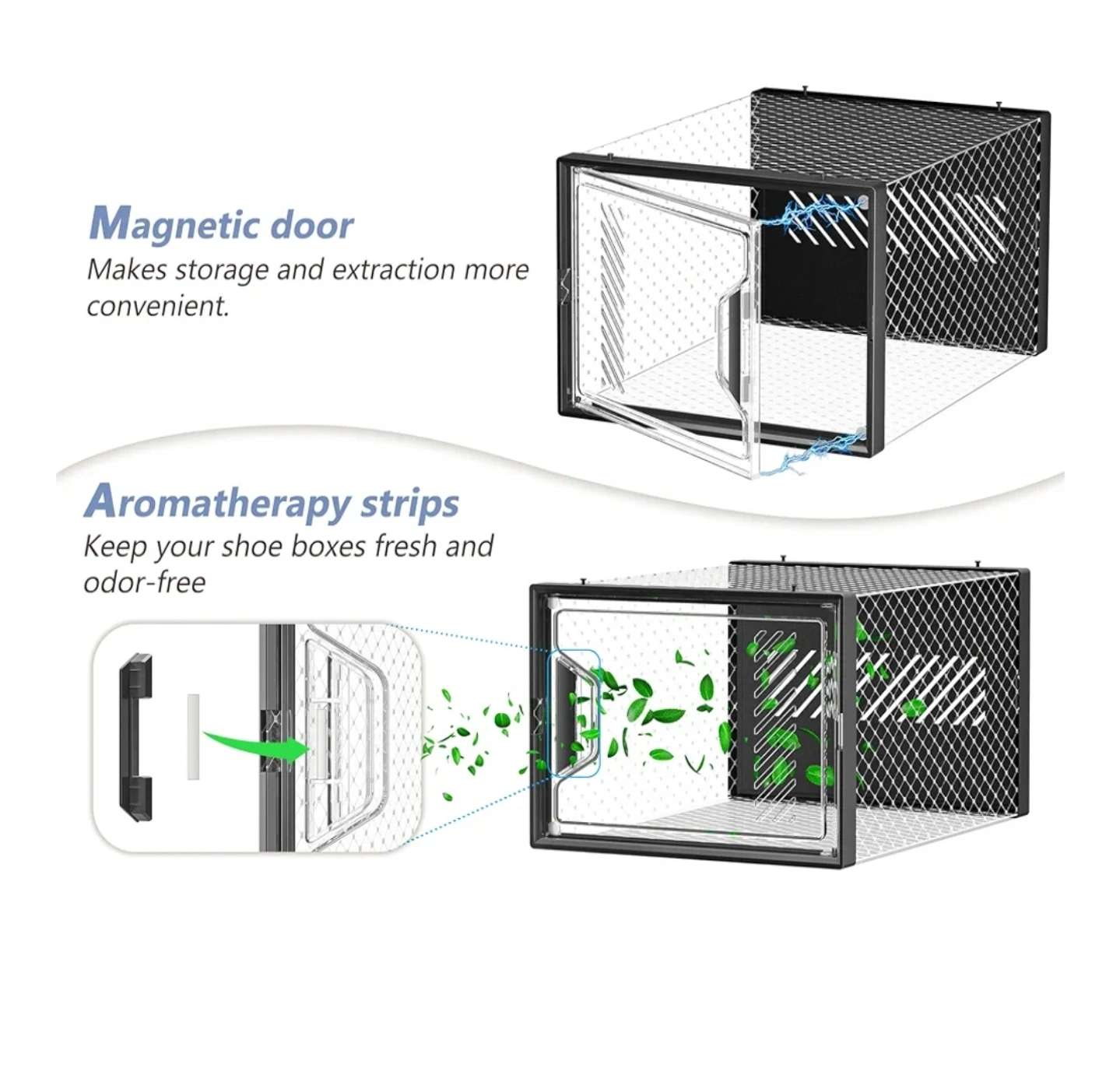 Set of twelve stackable shoe boxes. Clear plastic construction with black frames. Magnetic closures for easy access. Includes aromatherapy strips. Boxes are designed to stack securely.