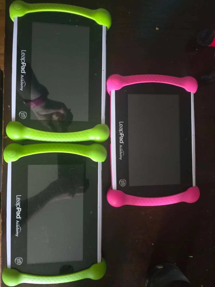 Selling a bundle of LeapPad Academy tablets! There are three tablets in total, two with green bumpers and one with a pink bumper. Great for kids learning and entertainment.