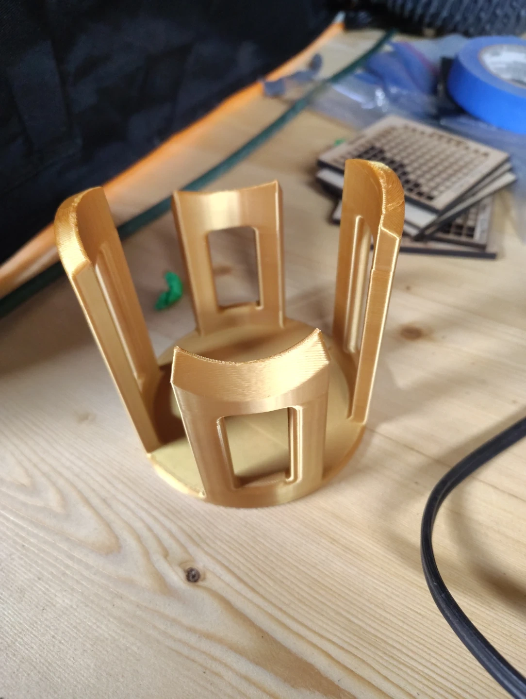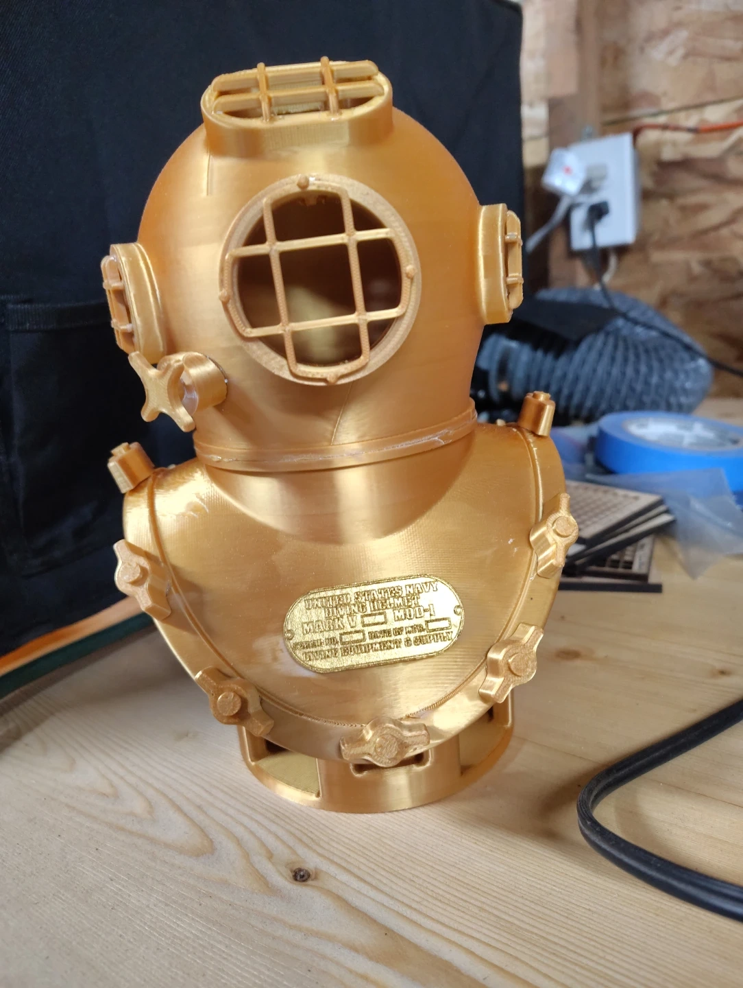 This is a 3D printed replica of a vintage diving helmet. It's gold in colour and features a plaque on the front. It's a decorative item that looks like the classic Mark V model. This would make a cool display piece for a collector!