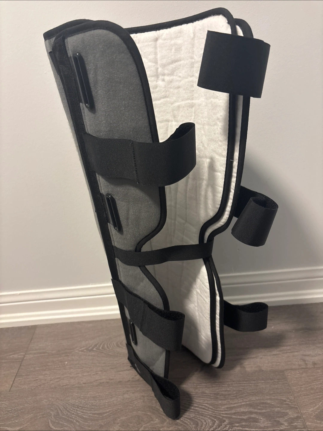 Grey fabric immobilizer with adjustable straps. Aluminum crutches with adjustable padded hand grips. Brand new condition. Suitable for injury recovery or post-surgery.