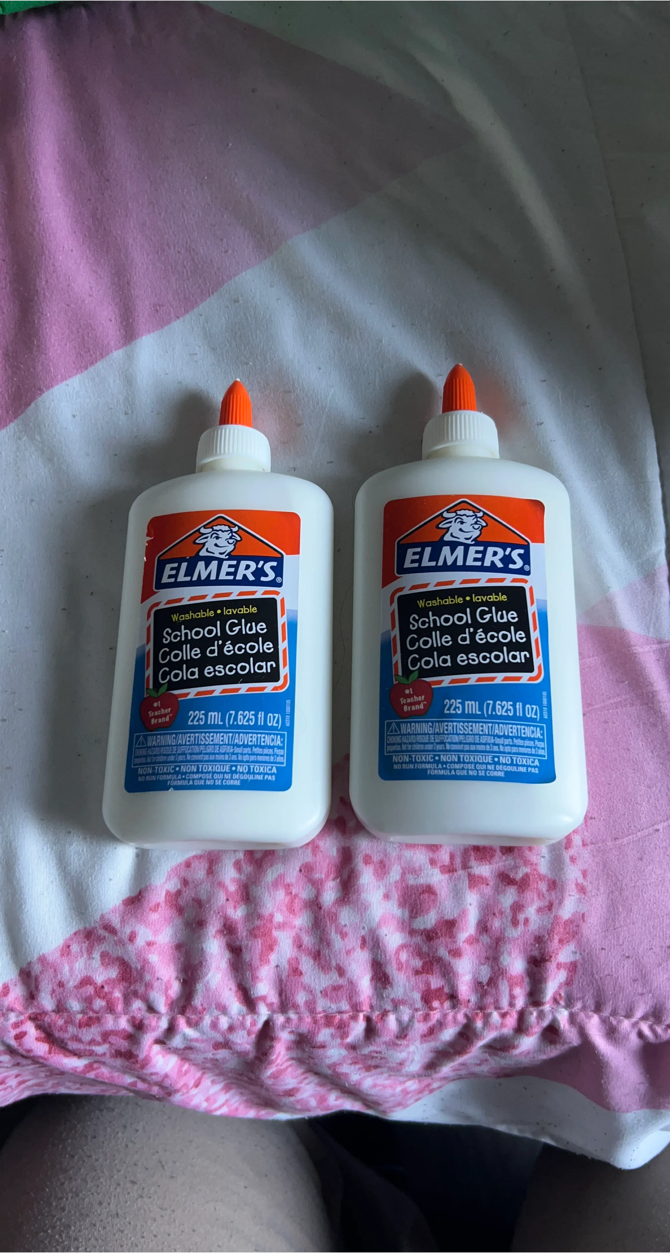 Selling two bottles of Elmer's School Glue! Each bottle contains 225 mL (7.625 fl oz) of washable glue. Perfect for school projects and crafts. It's non-toxic and has a no-run formula, so it's safe and easy to use for kids