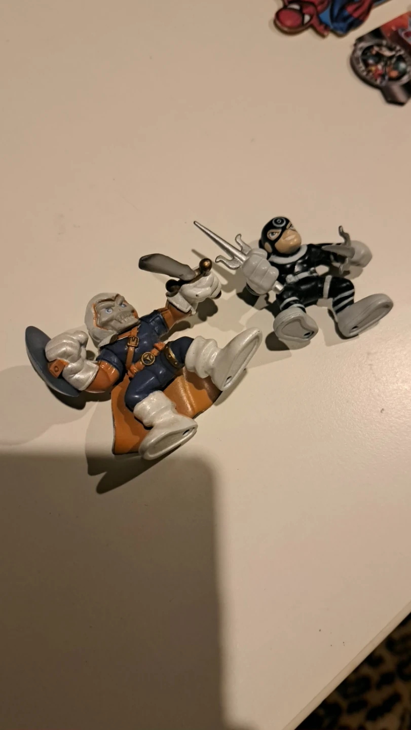 These are two Marvel Super Hero Squad action figures, featuring Taskmaster and Bullseye.