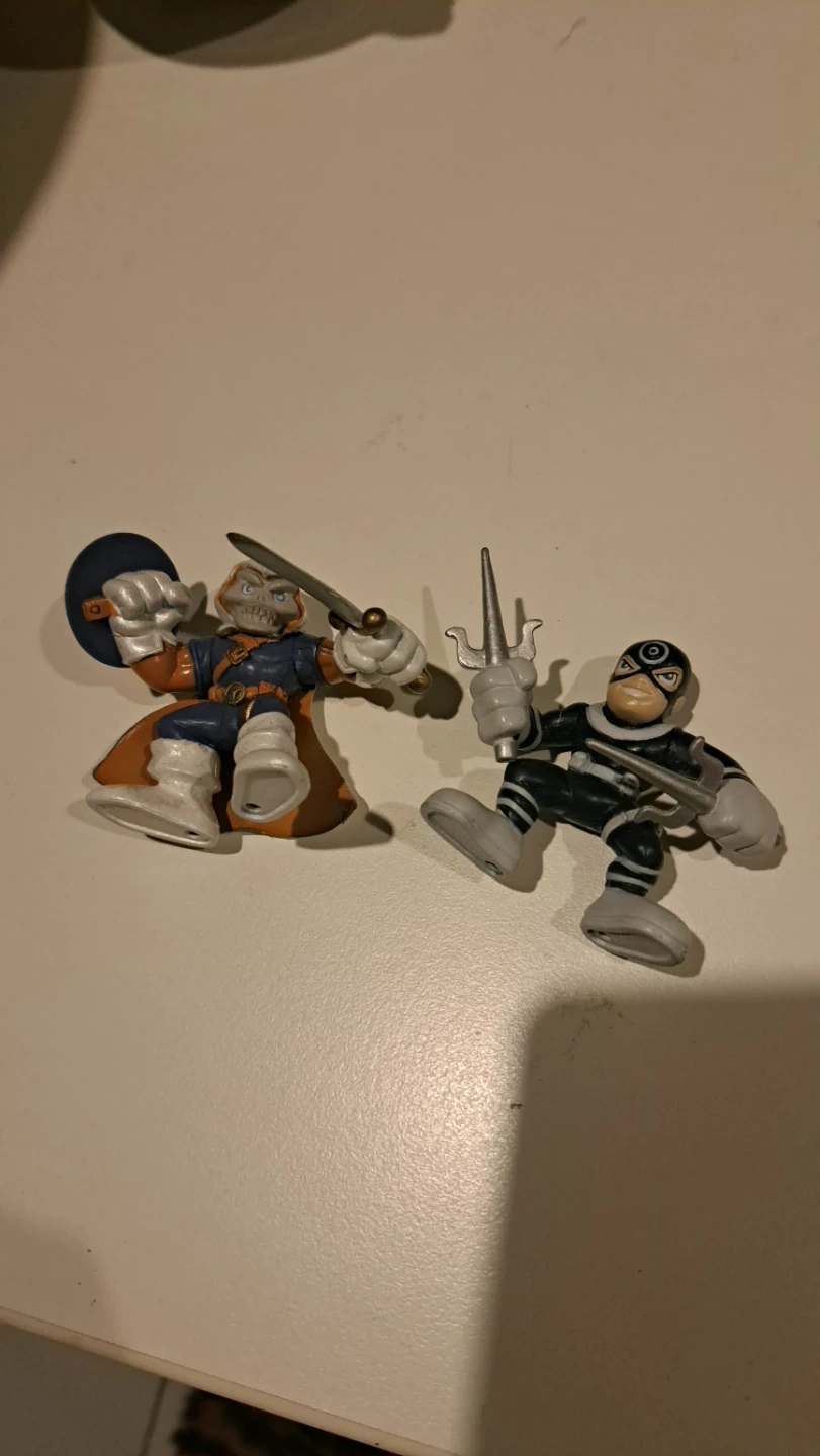 These are two Marvel Super Hero Squad action figures, featuring Taskmaster and Bullseye.