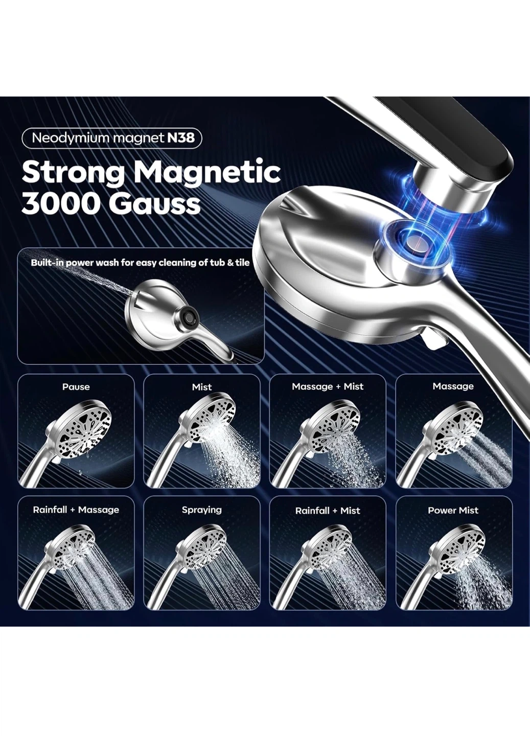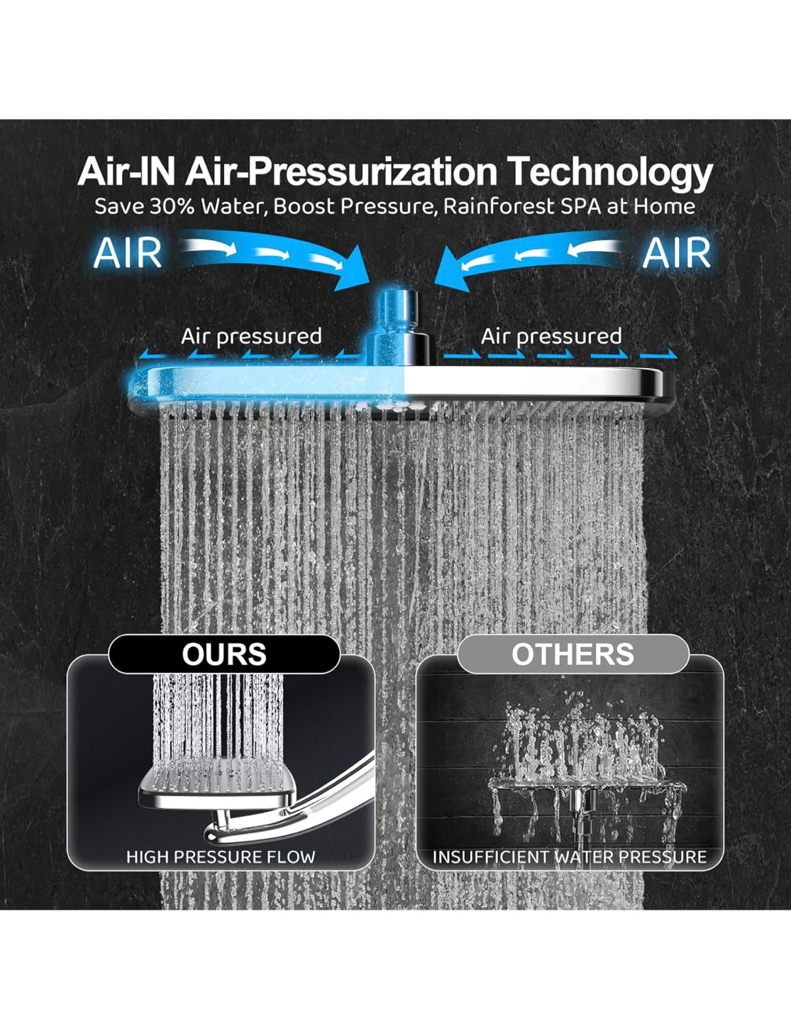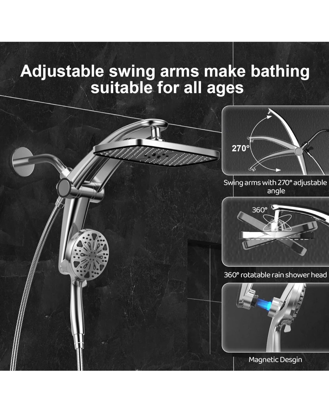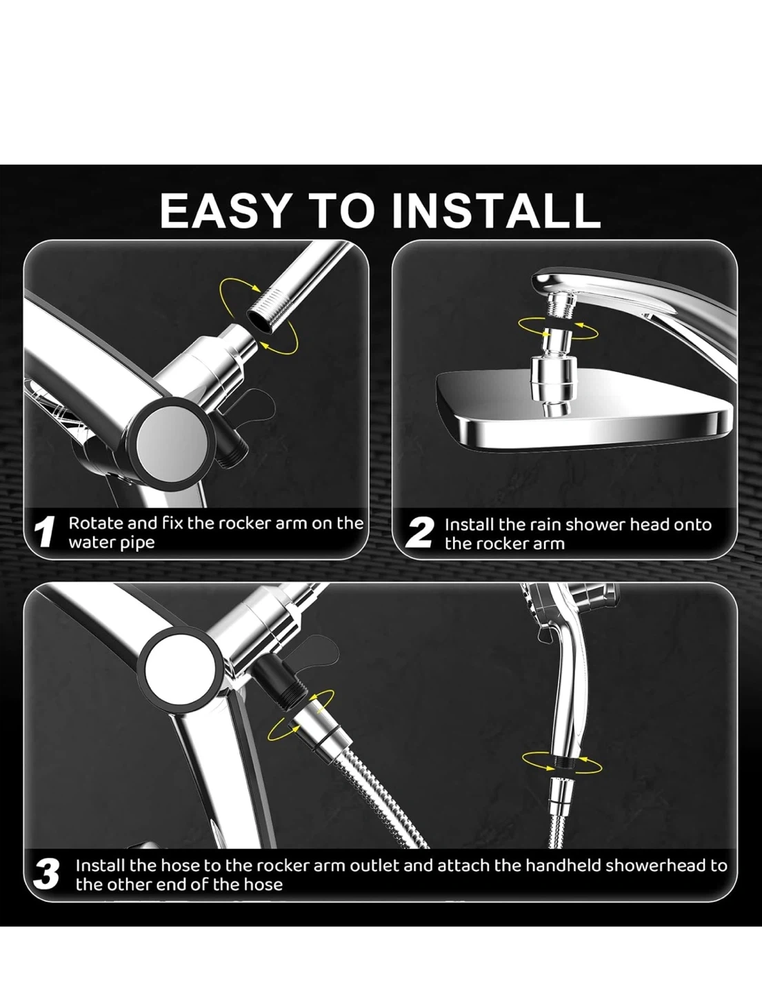This shower head system offers an immersive rainfall experience with a handheld spray combo. It features anti-clogging nozzles, 8 hand sprays, and 3 modes. The panel is 12" large with high pressure and high flow rate (2.5 GPM).