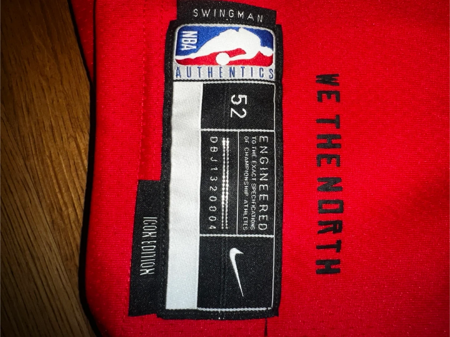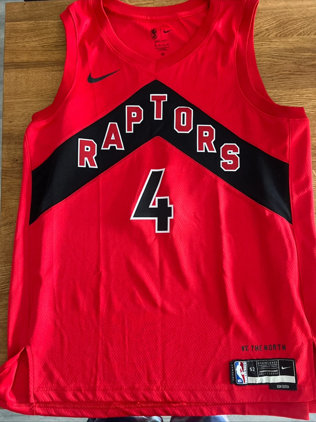 This is a red Toronto Raptors "We The North" Icon Edition Swingman jersey featuring Scottie Barnes and his number 4. It's made with Nike Dri-FIT technology. The size is 52, which is XL. It's engineered for the exact specifications of championship athletes.