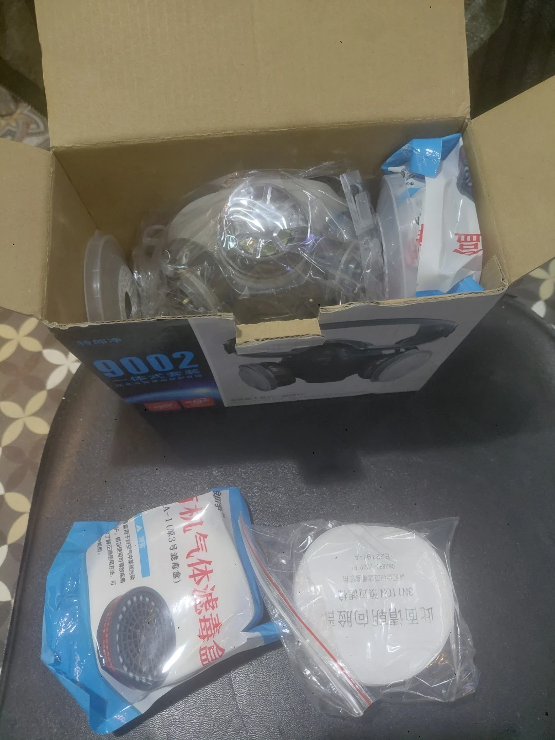 This is a TBP 9002 gas mask respirator. It includes a mask and filter cartridges. Respirator made of durable materials.