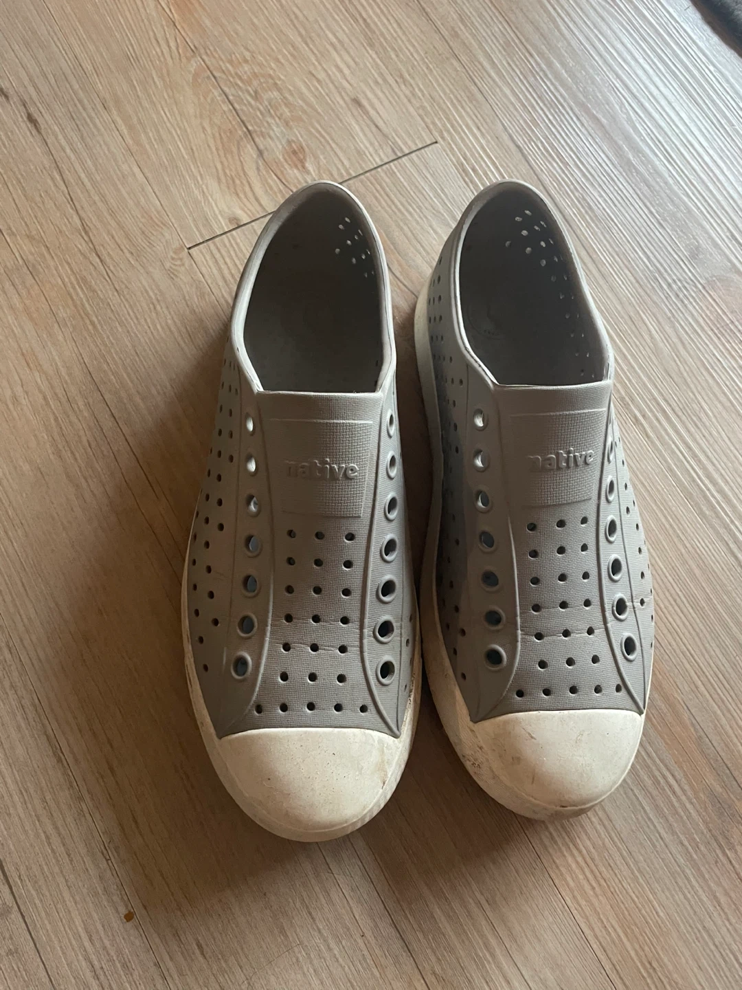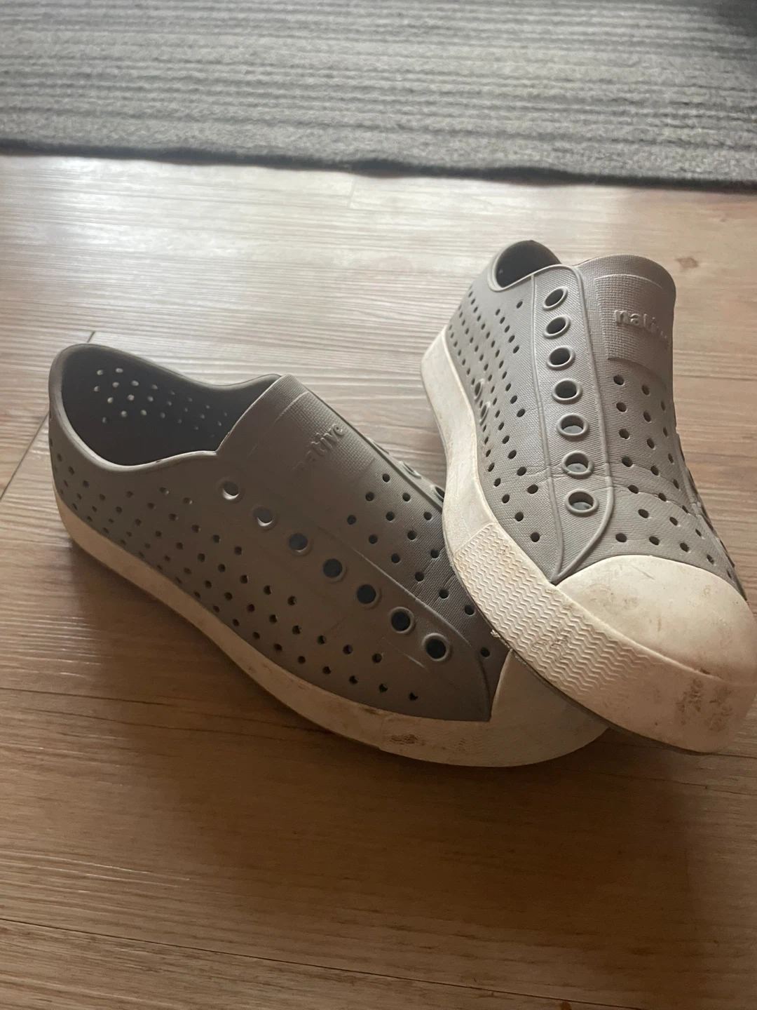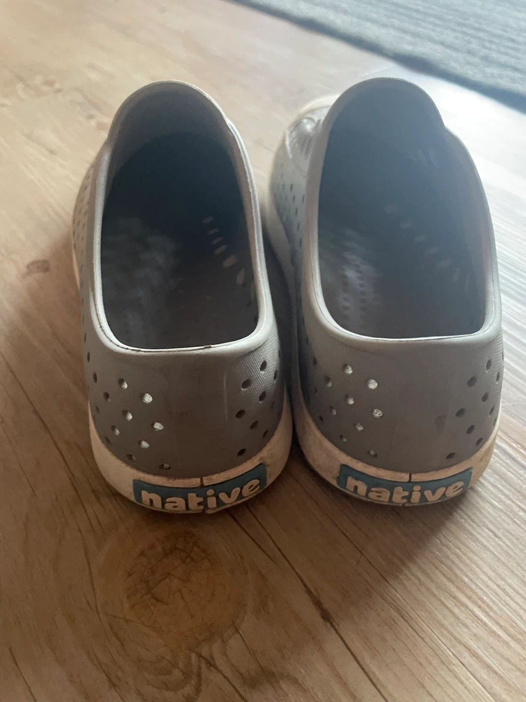 These grey Native shoes are easy to slip on. They're made of a durable, waterproof material and have plenty of holes for ventilation. These are great for kids who love to play outside or at the beach!