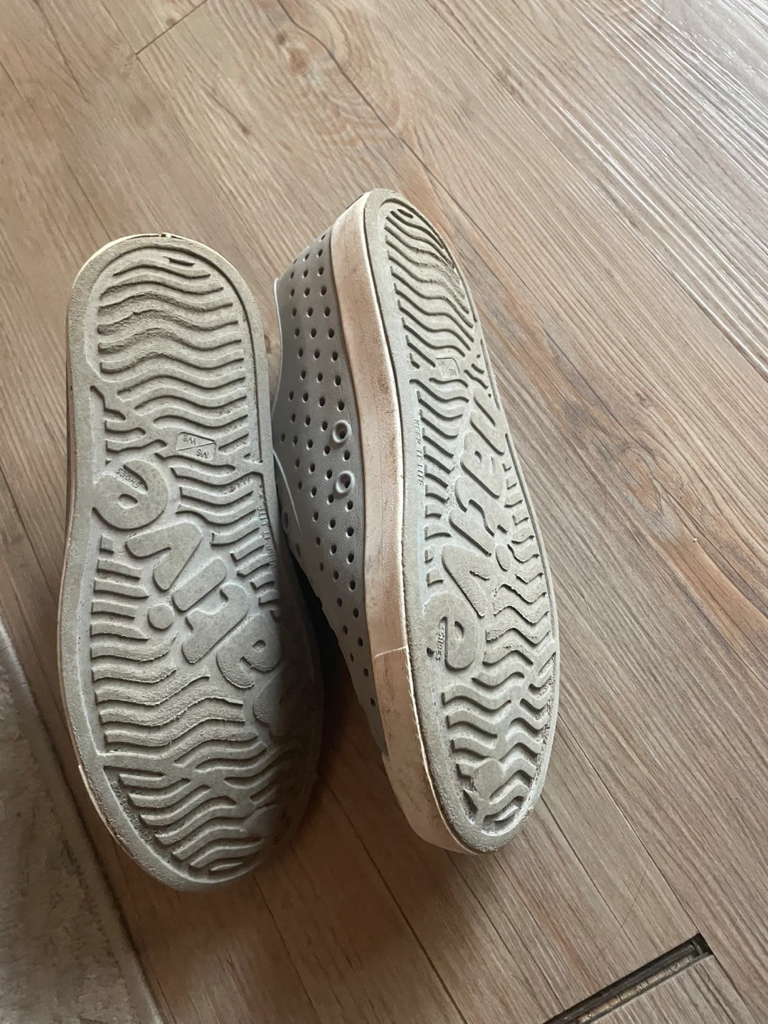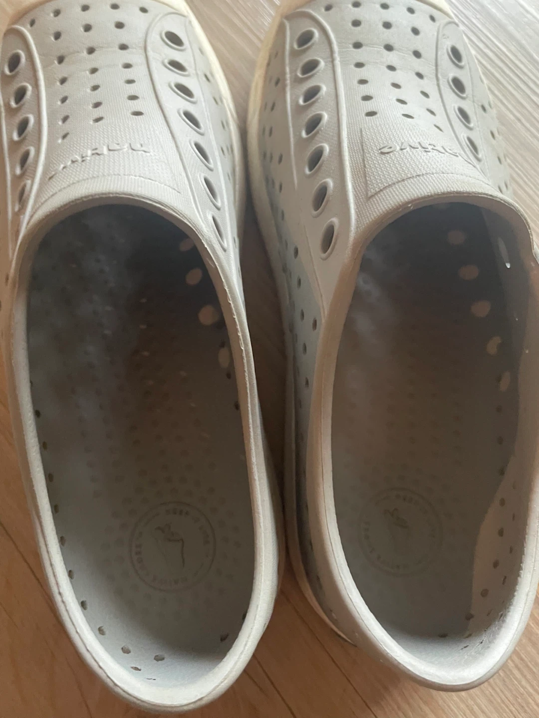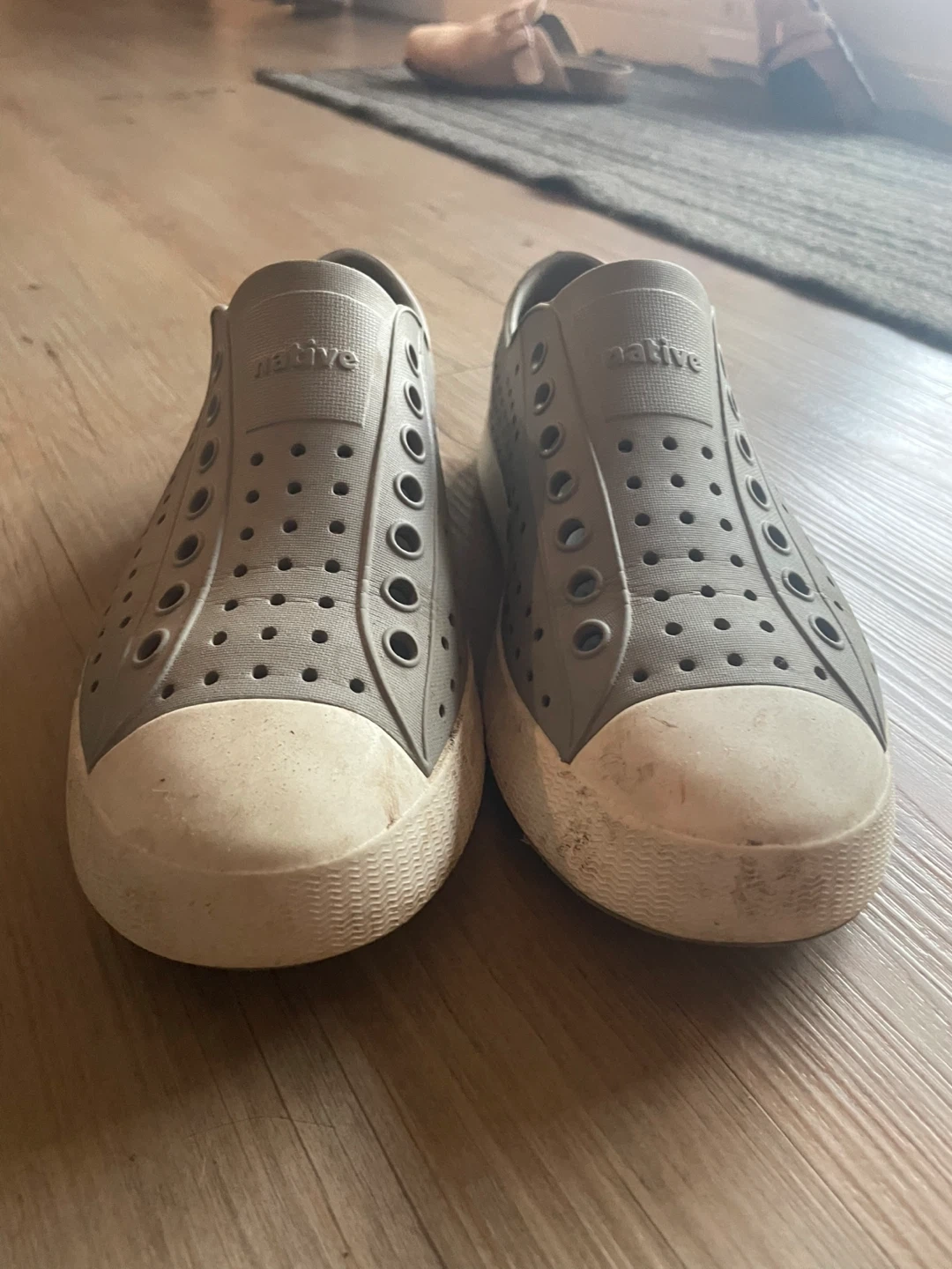 These grey Native shoes are easy to slip on. They're made of a durable, waterproof material and have plenty of holes for ventilation. These are great for kids who love to play outside or at the beach!