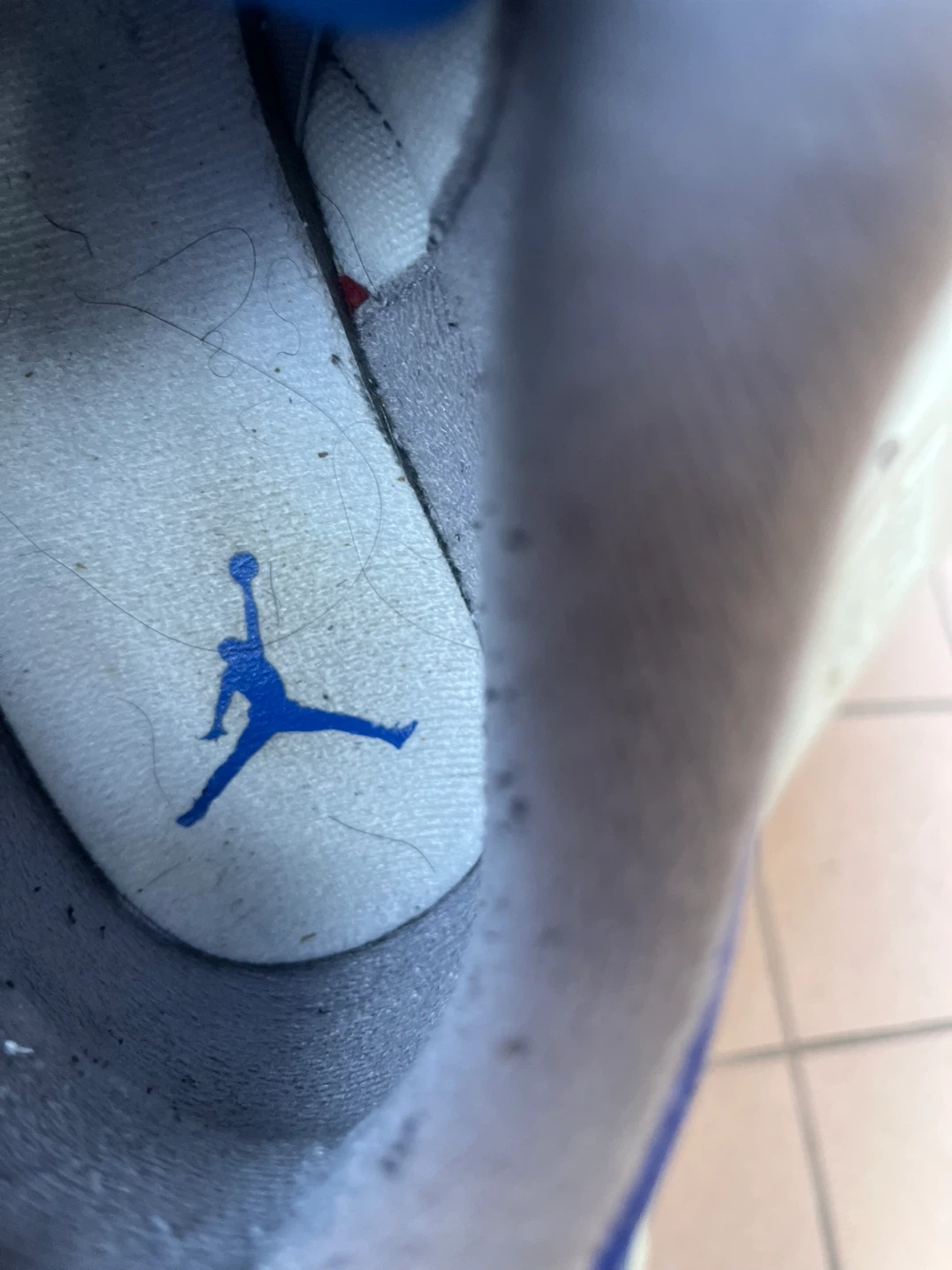 White leather Air Jordan 3 Retro sneakers with blue and grey accents. These shoes feature a Jumpman logo on the insole and outsole. Size US 9.5.