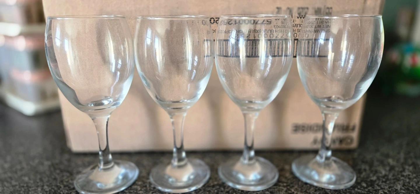 Four clear wine glasses are available. These glasses are made of glass and appear to be standard wine glass size. They're suitable for serving wine or other beverages.