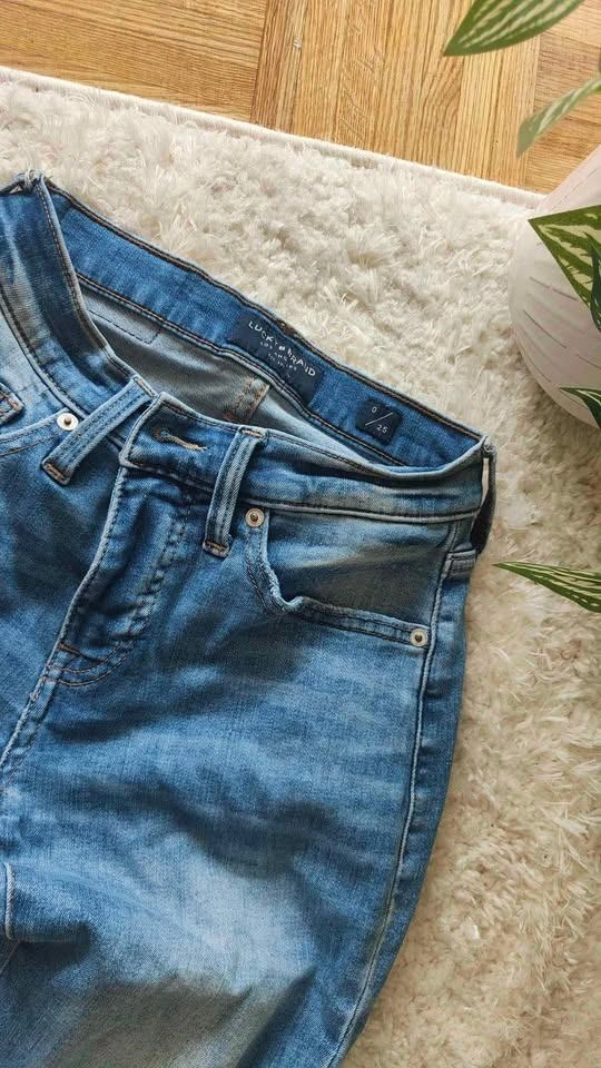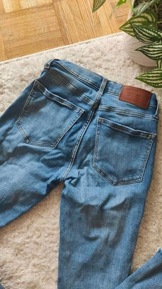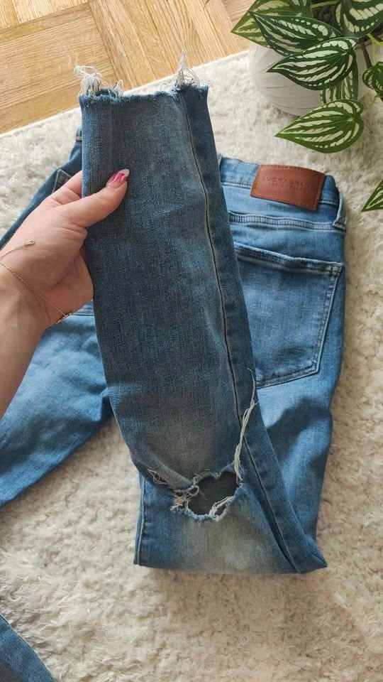 Selling a pair of Lucky Brand jeans in a size 0/25. They are a light wash denim with intentional distressing and some wear and tear. Perfect for a casual, lived-in look!