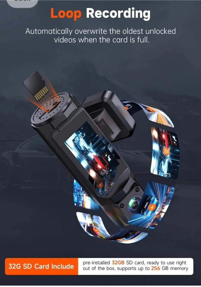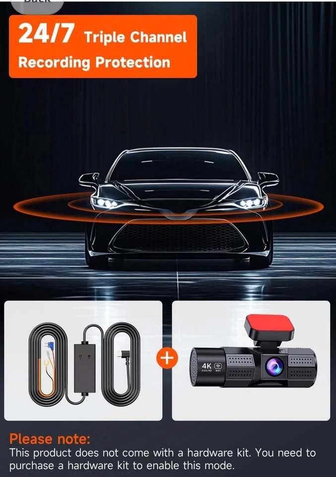 This is a new, in-box 3-channel 4K dash cam with front, rear, and interior cameras. It offers 360° coverage, recording clear video day and night with its night vision capabilities. Connects to your smartphone via WiFi to easily view and download footage. Features loop recording and a G-sensor that automatically locks important video clips in case of impact. The design is low-profile for easy installation. Includes installation guide and video. Comes with a 24-month warranty and lifetime support.