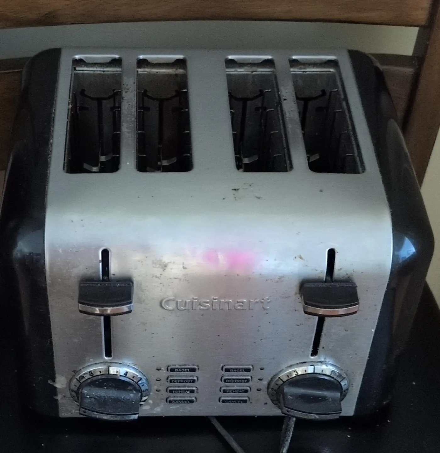 This is a Cuisinart 4-slice toaster in silver and black. It has various browning settings and functions like bagel, defrost, and reheat. Perfect for toasting bread, bagels, and more!