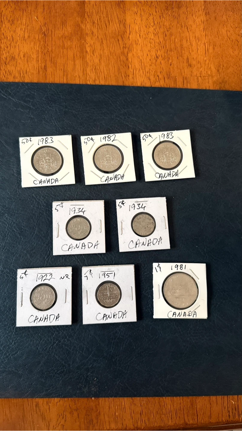 A collection of Canadian coins including 50 cent coins from 1982 and 1983, 5 cent coins from 1934, 1922, and 1951, and a 1 dollar coin from 1981.