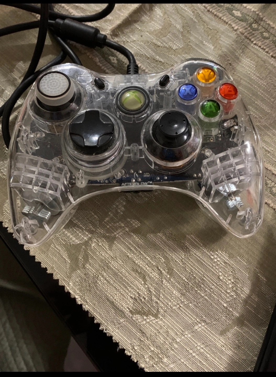 Wired controller. Transparent casing. Includes cord. Buttons and thumbsticks appear to be in good condition.