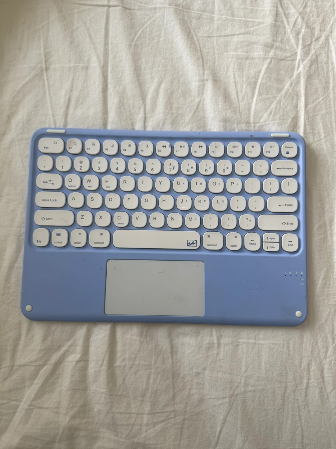 This is a blue wireless keyboard with a built-in trackpad. It's compatible with Android, Windows, and iOS. Includes all keys and functional trackpad.