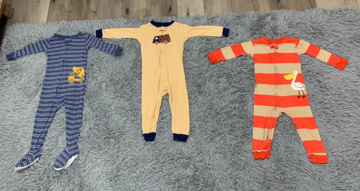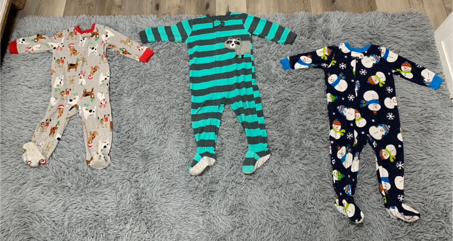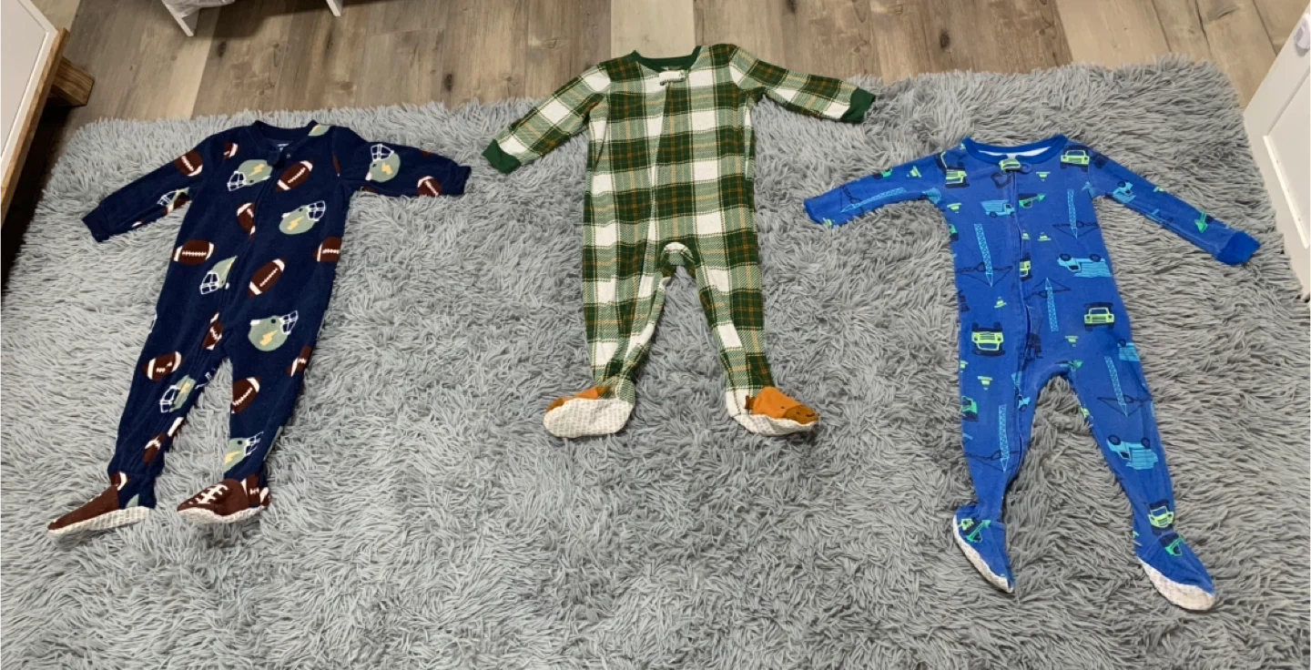 Selling a bundle of 18 M baby footed pajamas and Rompers in various designs. These cozy pajamas are gently used and are in good condition, featuring fun patterns.