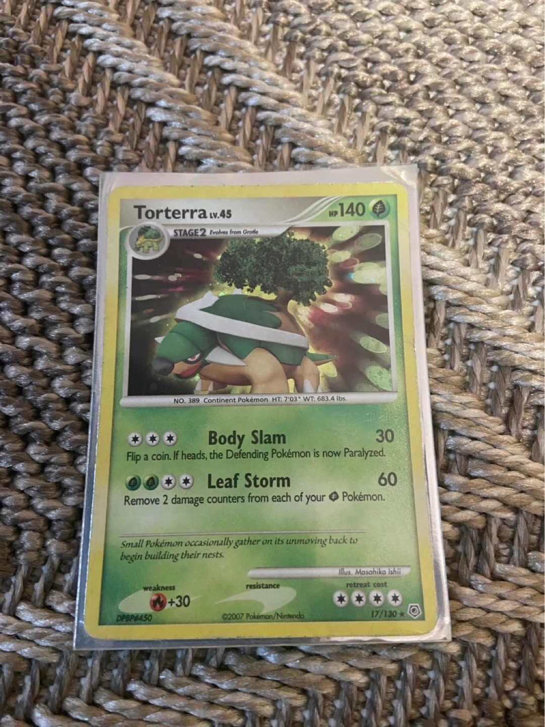2007 vintage Torterra Lv.45 Holo Diamond & Pearl 17/130 Pokémon card in decent condition and Rayquaza card sleeve is included :)