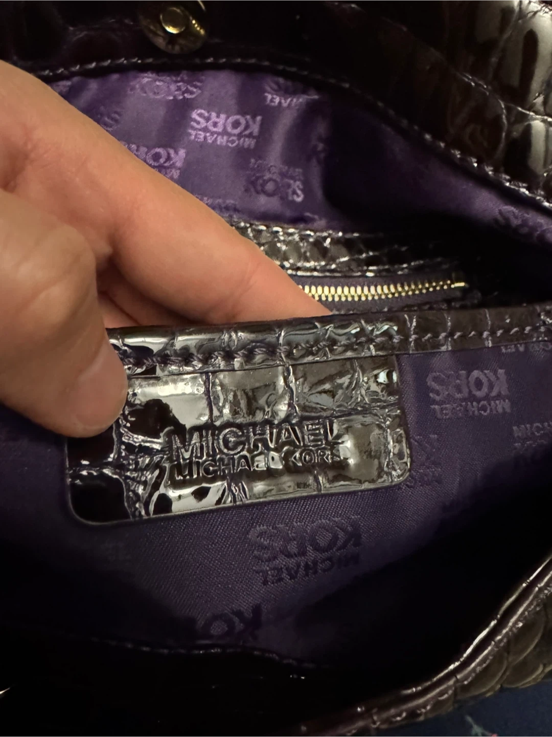 This is a Michael Kors tote bag with a croc-embossed exterior in a lovely shade of purple. The interior lining also features the Michael Kors logo. In great condition. Cash please. Pick up from Marine drive skytrain station.
