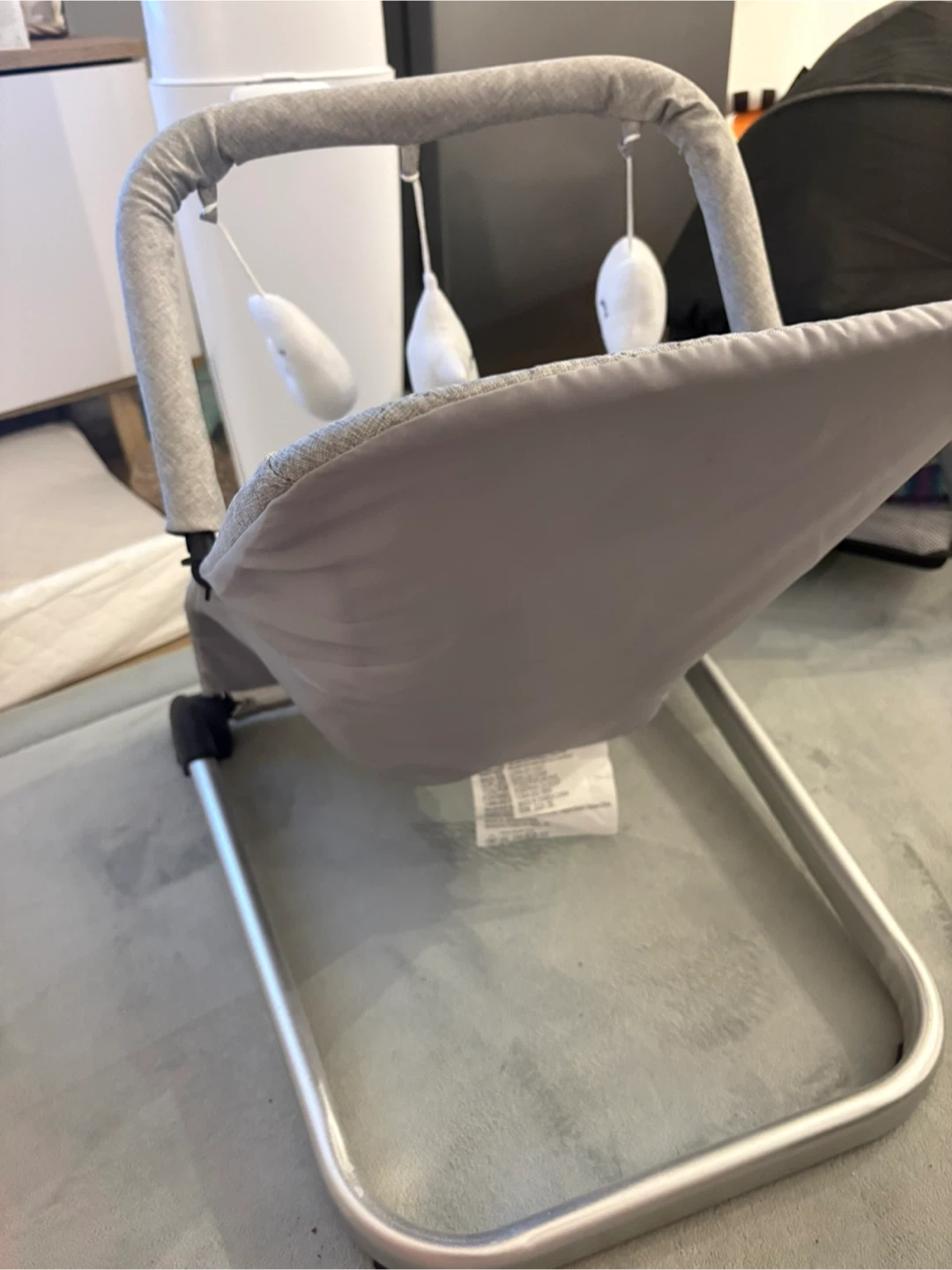 This is a grey Baby Joy rocker chair. It comes with a toy bar featuring plush cloud, moon, and star toys. It's a comfortable spot for your little one.