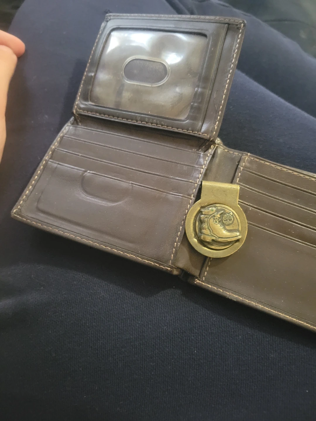 Brown leather bifold wallet from Timberland. It has multiple card slots and an ID window. Features a metal money clip with Timberland logo.