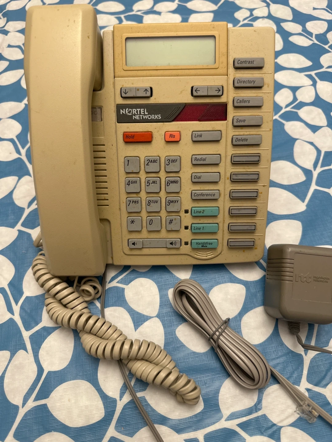This is a Nortel Networks office phone. 9417CW. It was on the kitchen wall. Don’t have a home phone anymore so don’t need it. Powers up.